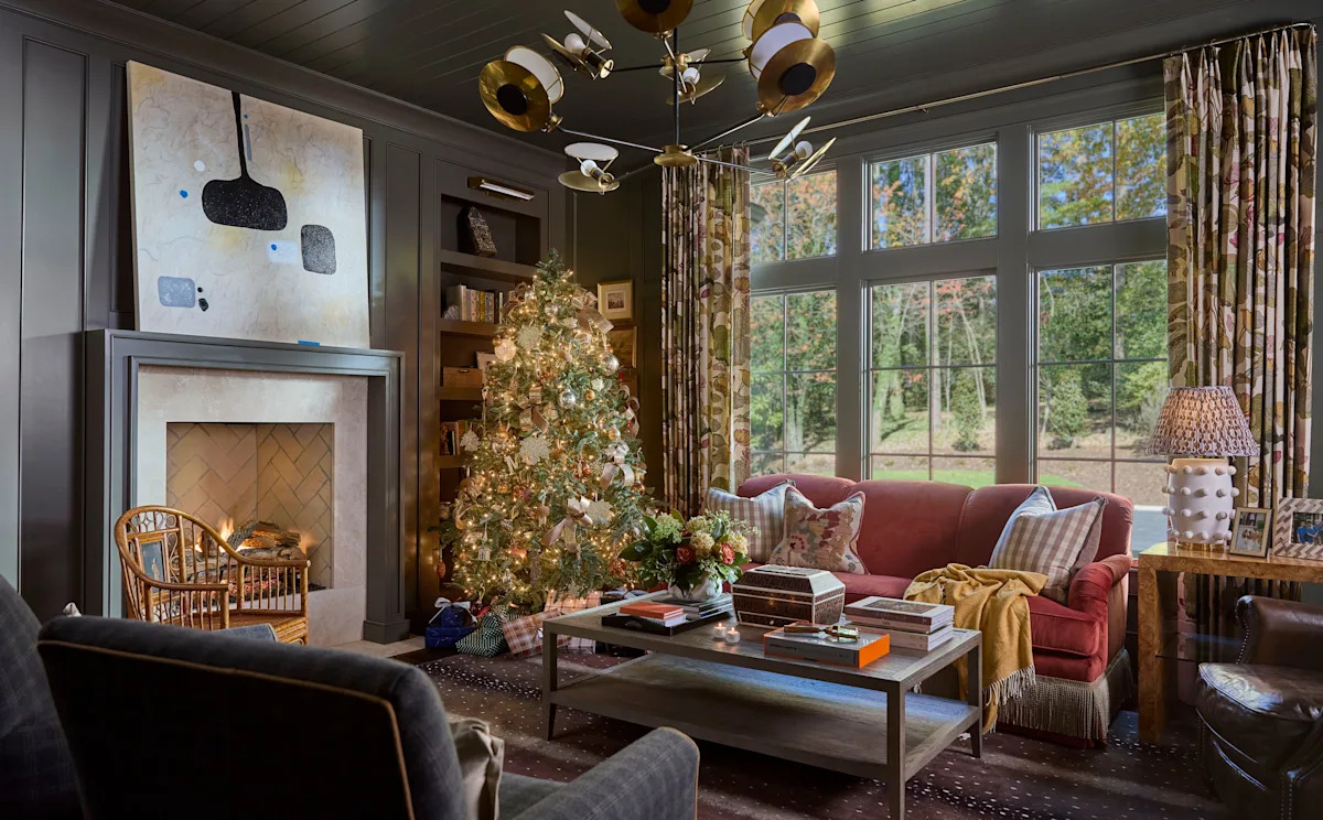 For her family study, Maggie Griffin of Maggie Griffin Design, knew a cozy tree would fit the bill. “The room’s color palette is warm and cozy with a little bit of moodiness, and I wanted the tree to reflect that tone,” Griffin shares. It’s decorated with rustic wood ornaments, white twinkle lights, and shiny metallic baubles to add sparkle without introducing too much color. As for the wrapped gifts, Griffin says, “To coordinate with the space, I chose more masculine wrapping paper in earthy tones of green, brown, and umber.”