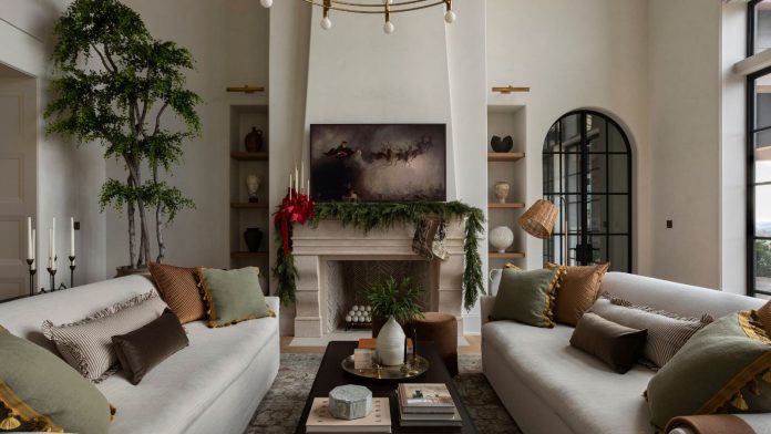 It’s a pared-back approach to decorating for the holidays, but by curating a small area, it becomes the hub of warmth and festivities. For extra cosiness, consider rearranging your furniture so the sofas and chairs face the mantel.