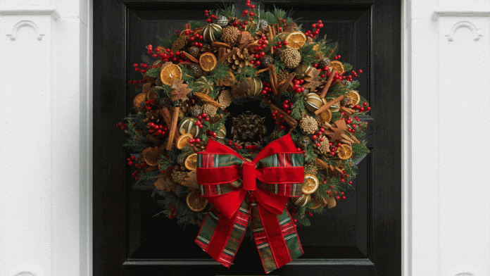 Neill Strain’s ‘Merry & Bright’ wreath shows you can step up your accessories while still staying traditionally festive.