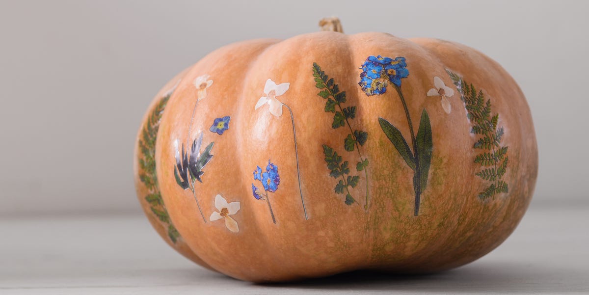 On a plain orange pumpkin, paint delicate flower and greenery designs for a cottagecore-style look. Leave space between the paintings for a dainty design, or crowd them together for a maximalist, wildflower-garden touch.