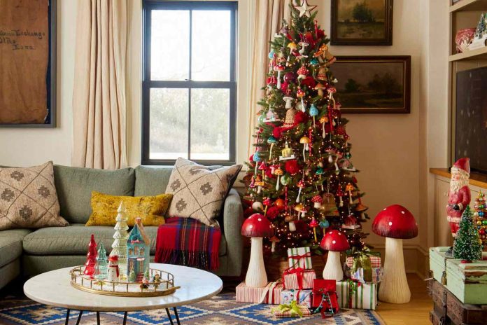 The key to this kind of eclectic Christmas decorating, Wyse says, is massing things together: “If you corral things on little trays or group them, it doesn’t feel so hodgepodge, and it draws your eye toward them.”
