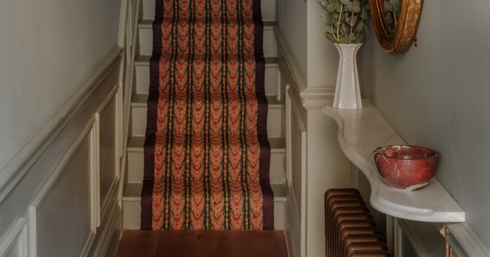 Bold stair runners are a theme here, which, in my case, I’m simply translating to a graphic floor runner. Stephens’ logic for this project was to enhance the beauty of the original floor tile by layering in a different pattern. “It’s a bit daring, but that’s what makes it work,” she says. The designer kept things feeling down to earth by painting the stairs in Farrow & Ball’s Pigeon, a soft green-gray, and bringing in a brighter console table from Rose & Grey.