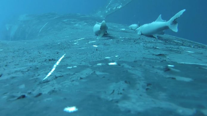 Remoras are harmless to the 40-metric ton (44-U.S. ton) giants of the ocean, feeding on the whales’ dead skin and sea lice in a mutually beneficial arrangement — or at least that’s what scientists say. Meynecke said his footage suggested the whales found their hangers-on annoying.