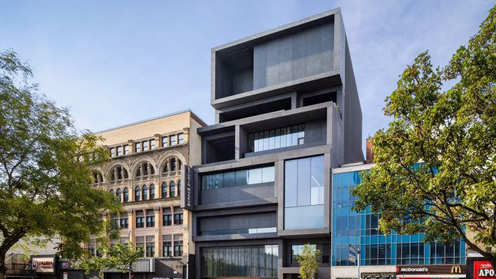 The building’s seven storeys of partitioned, stacked volumes made of a dark-grey precast concrete take cues from the brownstones and churches of Harlem, according to the studio.