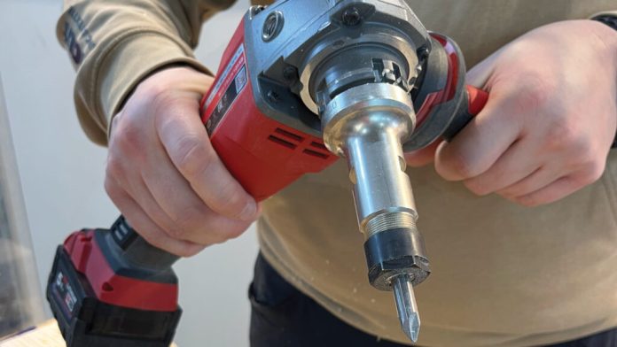 This fits to a standard 4.5in grinder’s M14 spindle thread and, with 6mm, 8mm and 10mm chucks, can accommodate all sorts of cutting, grinding and sanding tools.