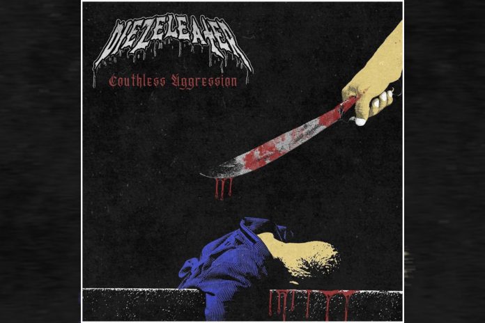 With a band name styled in ALL CAPS and “kvlt and tru” spelling, you know you’re going to have some sort of preconceived notion of the Des Moines-based metallers DIEZELEATER (Should it technically be DIEZELDRINKER?) and I won’t tell you mine. The album cover of Couthless Aggression, made by graphic designer mysteriousfour, features an oversaturated hand clenching a bloody machete, and is a nice riff on 1980s horror movie posters. The vibe piqued my interest, so consider me engaged (I was before, promise).