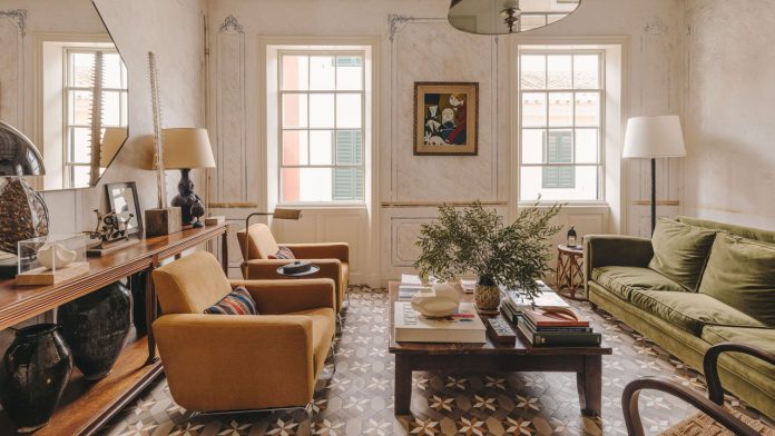 The British occupation of Menorca during the 18th century left an indelible mark, not least in the Georgian architecture in Mahón’s old town. which is where Dorian and Thomas found this handsome terraced house. ‘It’s a bourgeois townhouse, but it has certain codes of grandeur,’ Dorian explains. Like most buildings on the island, it is constructed from marés, a local sandstone – the only type quarried on the island – which has a lovely texture and a warm ochre hue. ‘It’s also porous and prone to humidity. But that’s part of the charm,’ Dorian says dryly.