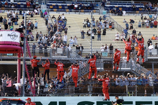 During the 2022 Xfinity Series race at Charlotte Motor Speedway, Noah Gragson’s engine lost a cylinder at the end of Stage 1. Below you can see John Kendrach and Jereme Jackson in Hendrick Motorsports firesuits assisting the rest of the team in Bass Pro Shops firesuits. Gragson’s engine was repaired, and the team finished 4th in the race.