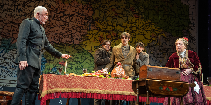 The boys are soon whisked away by Trifko (Adrien Rolet) to meet Captain Dragutin “Apis” Dimitrijevic (Patrick Page), who serves them food prepared by his eccentric chef, Sladjana (Kristine Nielsen), and regales them with tales of regicide. Convincing the young men that their tuberculosis is a metaphor for Austria-Hungary’s chokehold on Europe, Apis persuades the group to travel to Sarajevo and kill the Archduke.