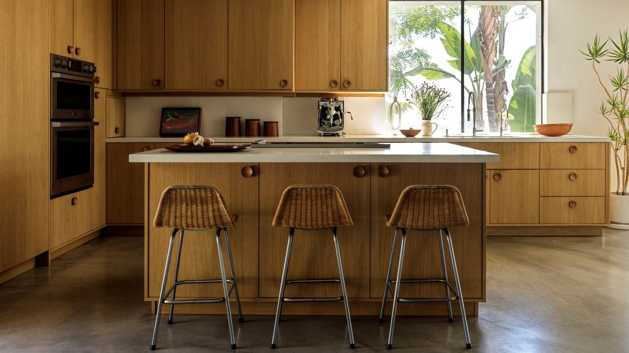 In 2020, Caroline and her husband, artist Chris Belhumeur, found their 1970s style home next to Griffith Park, a place she calls more wild than manicured. “We have coyotes, deer running through our property, skunks, raccoons, owls,” she says. “We can’t grow anything because it’s always been eaten by something. But I don’t mind; we can share.” They do draw the line at their chickens that roam on the property, though—those aren’t for sharing. Because the home was turnkey, the backyard needed the most work, including a rehaul of new landscaping and a re-stuccoed pool and walls. But that was just the starting point for the duo with discerning eyes.