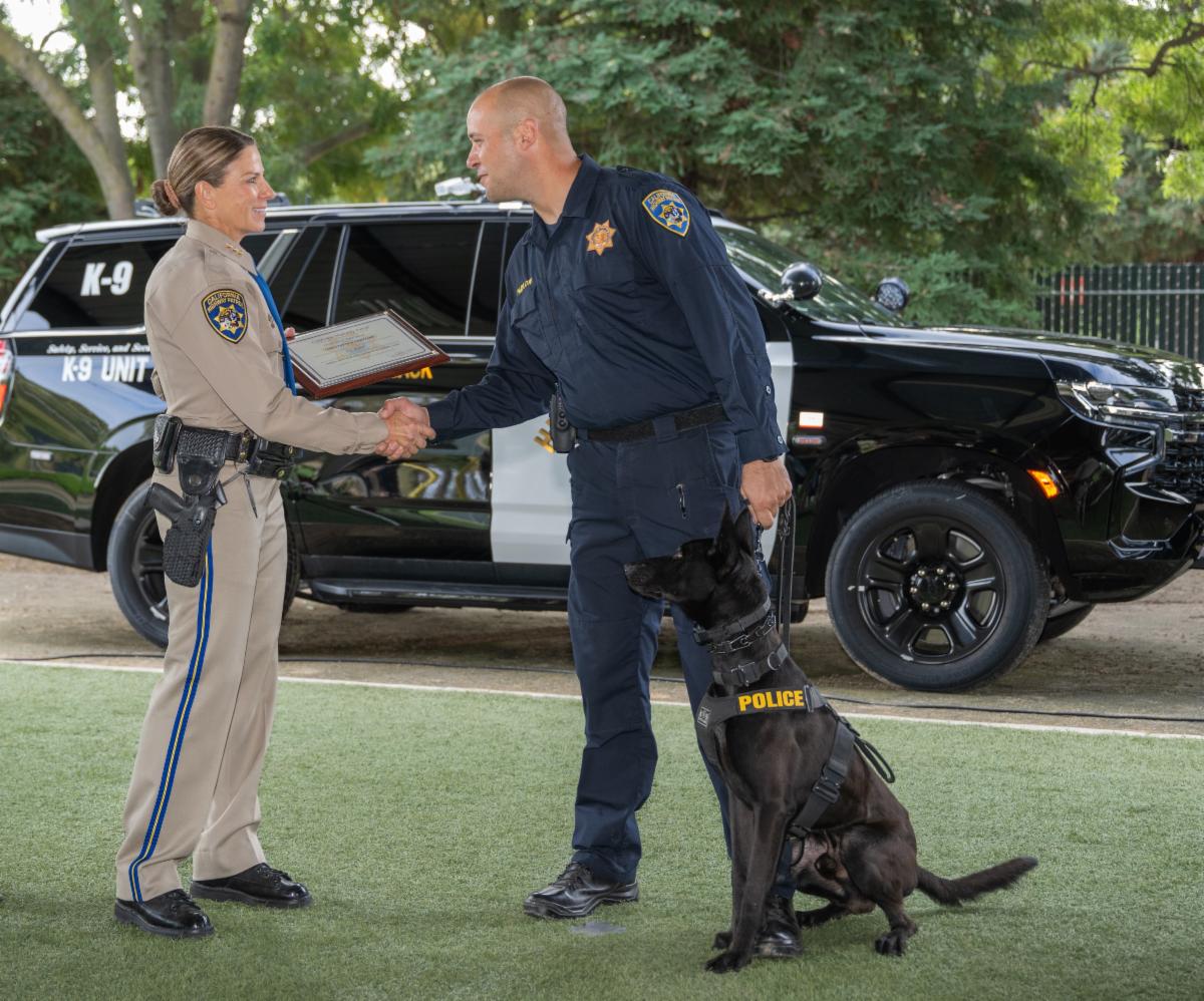 CHP Assistant Commissioner Robin Johnson presents Northern Division Officer Christopher Partlow with K-9 Judge the certificate of completion from POST (Peace Officers Standards and Training) meeting all the requirements, certifying the dog for law enforcement service during the recent graduation ceremony. Photo: CHP