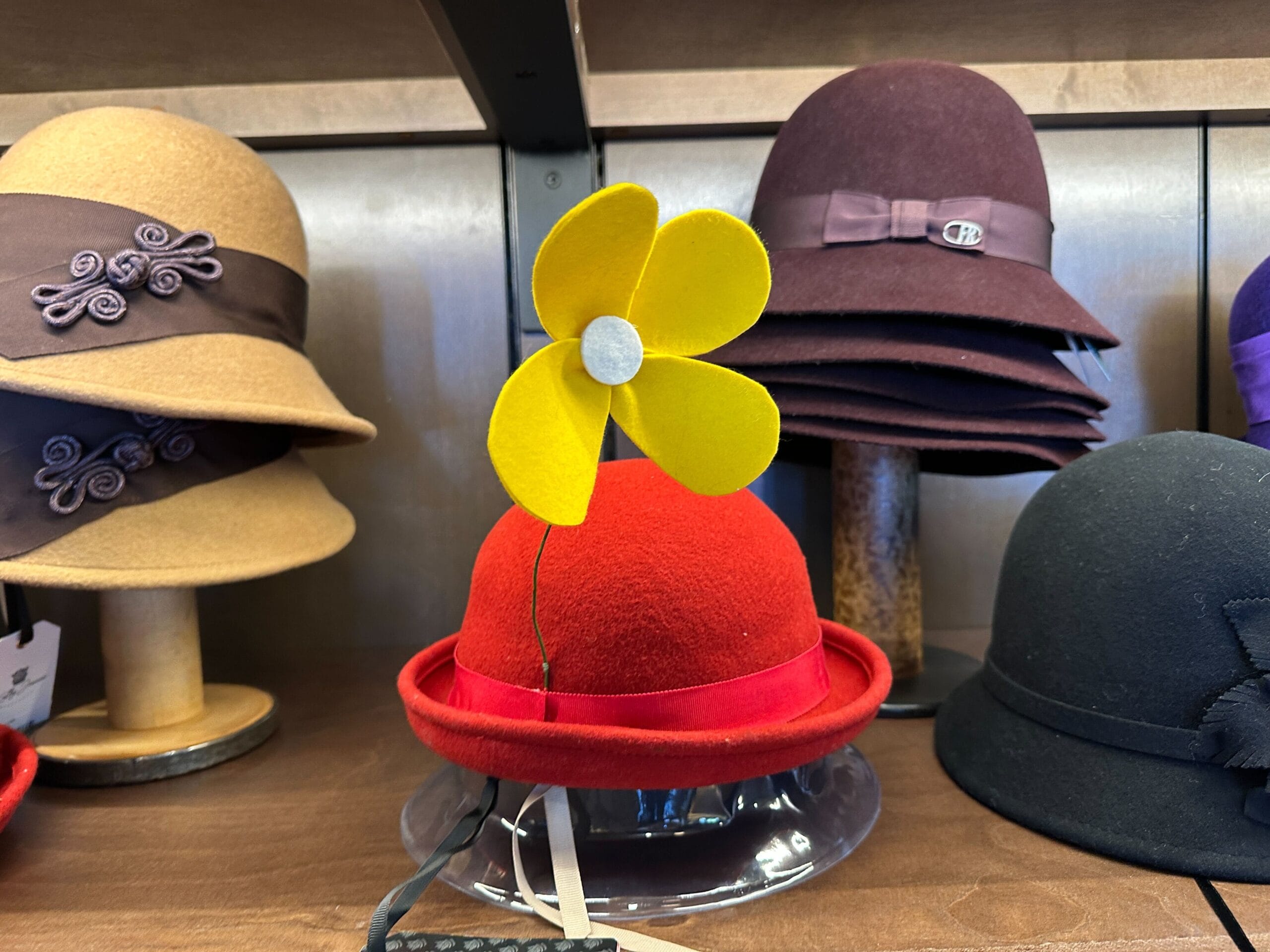 This is a red felt bowler hat with a red band. Attached on a wire is a yellow flower. Minnie has sometimes worn such a hat, including for her first appearance in Steamboat Willie.