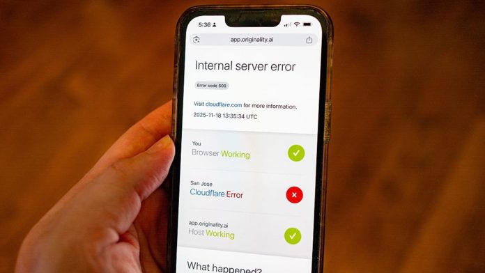 Person’s handing hold an iPhone displaying a Cloudflare Error while attempting to access a webpage, during an outage of the Cloudflare service, Lafayette, California, November 18, 2025.