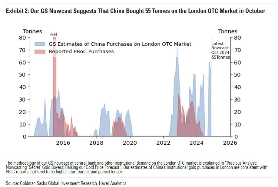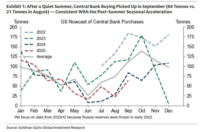 Our GS nowcast of central bank and institutional gold demand on the London OTC estimates September purchases at 64 tonnes (67 tonnes on a 12-month moving-average basis), up from 21 tonnes in August and consistent with the typical post-summer seasonal acceleration (Exhibit 1).