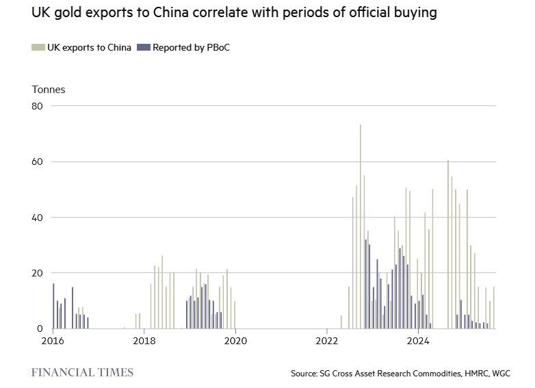 The FT notes that publicly reported buying by China’s central bank has been so low this year – 1.9 tonnes purchased in August, 1.9 tonnes in July and 2.2 tonnes in June – that few in the market believe the official figures. Instead, echoing the same trade data analysis we did back in 2024 (and ever since), the newspaper points to work done by analysts at Société Générale who estimate that China’s total purchases could reach as much as 250 tonnes this year, or more than a third of total global central bank demand.