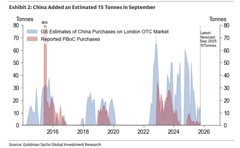 Goldman estimates that September purchases were led by the Middle East – Qatar at 20 tonnes and Oman at 7 tonnes – and China at 15 tonnes, extending the trend of massively underreporting its actual purchases (the official number was roughly 10% of that estimate).
