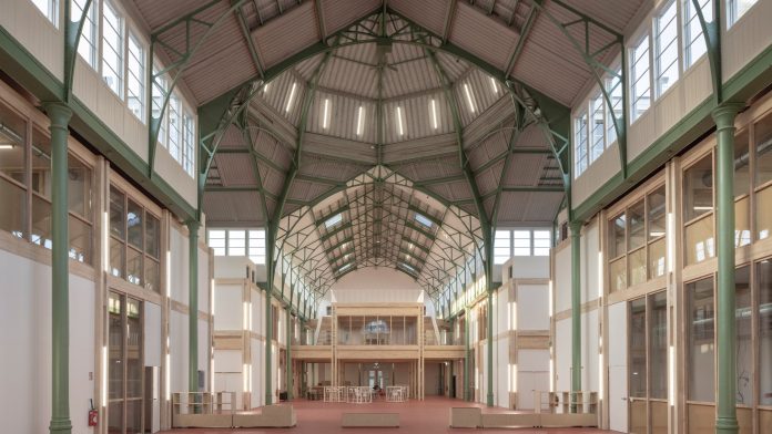 French architecture studios Atelier 9.81 and Perrot & Richard have renovated the Palais Rameau exhibition hall in Lille, inserting a modular and demountable timber frame into its heritage-protected steel shell.