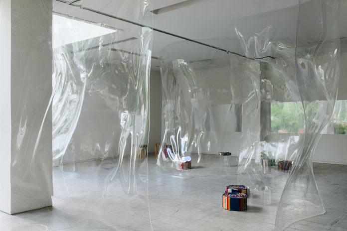 The panels were heat-formed in an industrial oven using steel moulds, a process as delicate as it was unpredictable, as the acrylic became almost liquid when heated, making the ultimate curves impossible to control. Matsuzawa embraced the risk, allowing ‘beautiful accidents’ to shape the final forms, discarding everything that felt too rigid, precise, or artificial. What remained was a series of ephemeral thresholds that appeared and dissolved as visitors moved through the space.