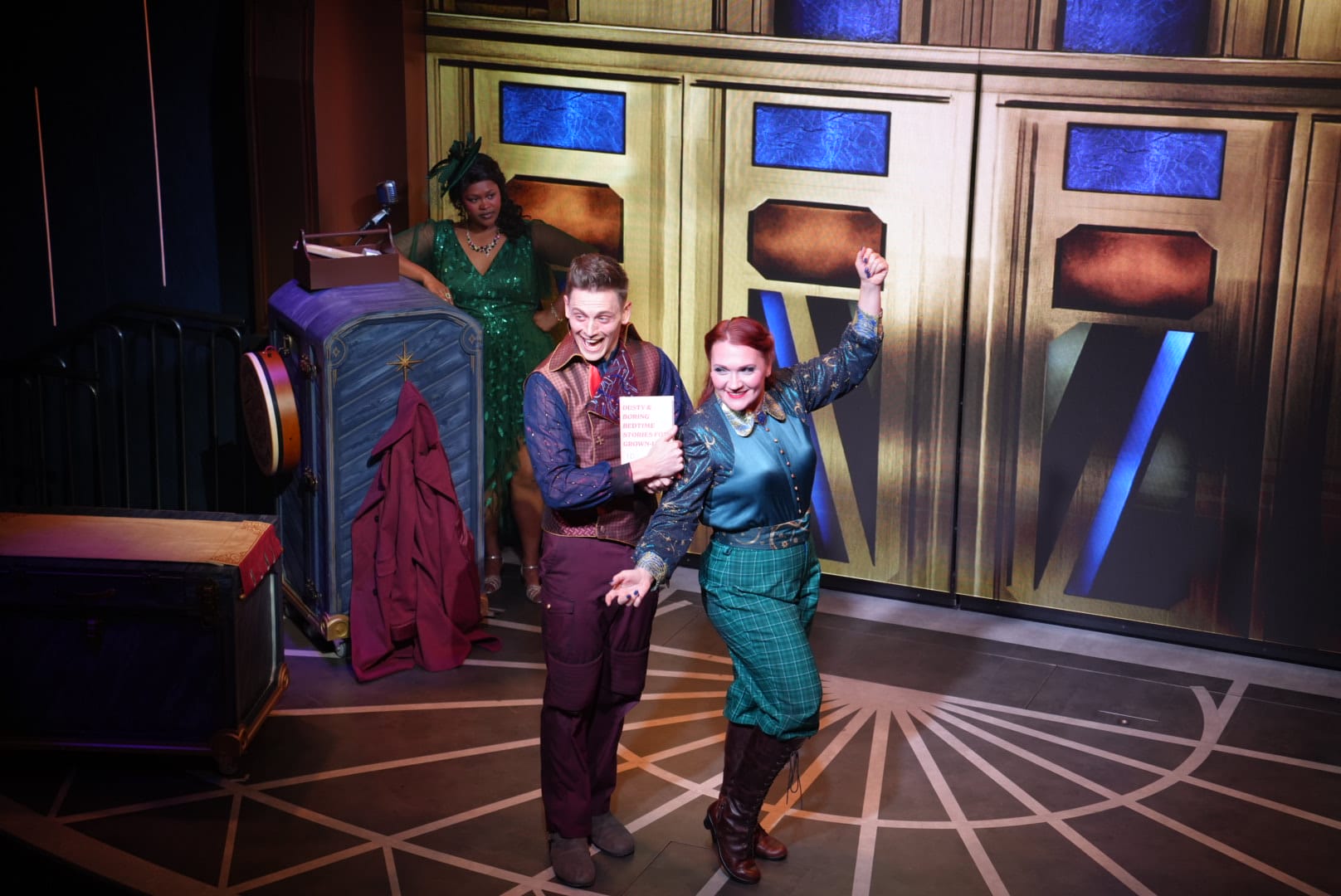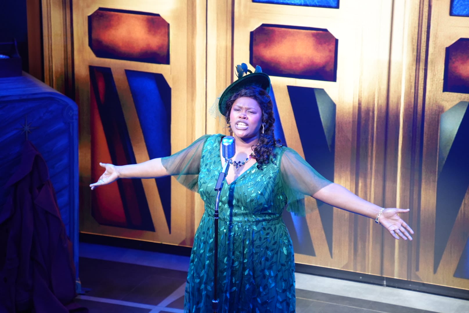 The show opens in Elixir Hall with singing host Violet Fox. She emerges in an emerald green, 1920s ensemble singing “Mr. Blue Sky.” After her song winds down, she introduces the Disney Destiny storytellers Zayah and Gamble.