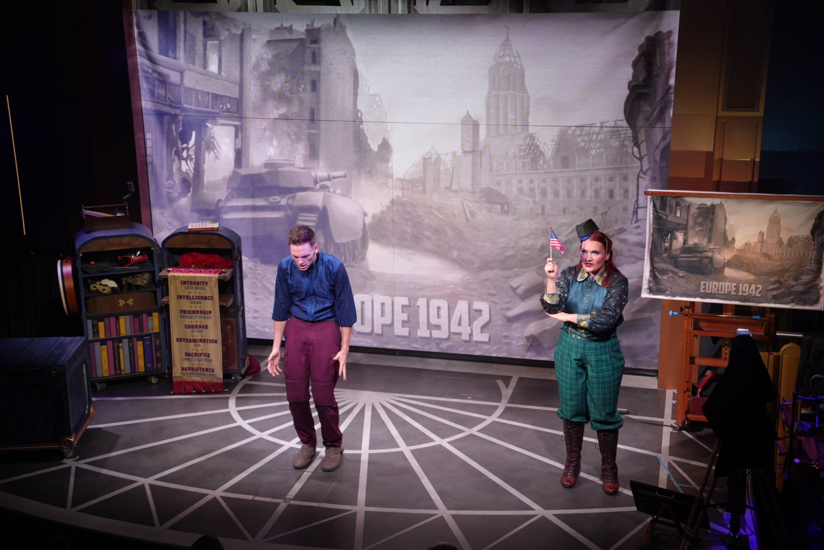 From there, Zayah and Gamble begin their tour of stories of beloved Marvel characters, beginning with Captain America in Europe circa 1942. After that, they bring audiences to the set of a fake infomercial segment entitled “Inventions with Tony.” Tony Stark is locked away in a cave, so audiences watch as the “bad guys” look through his inventions.