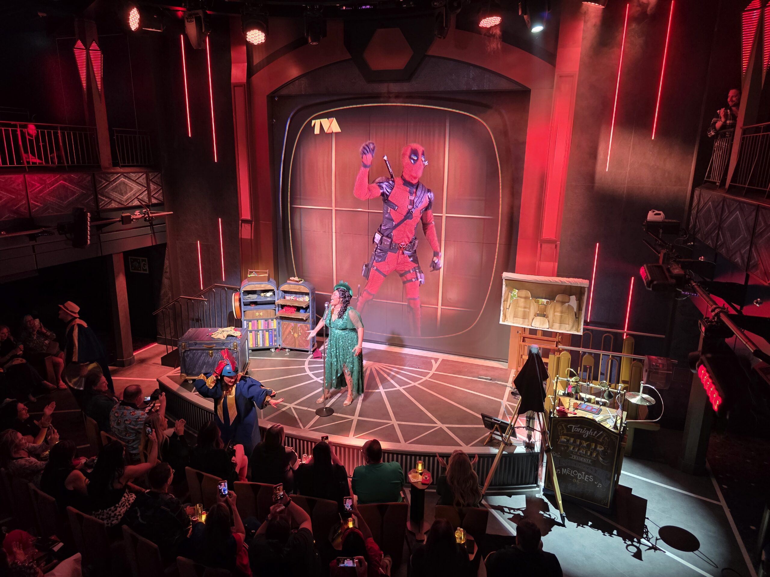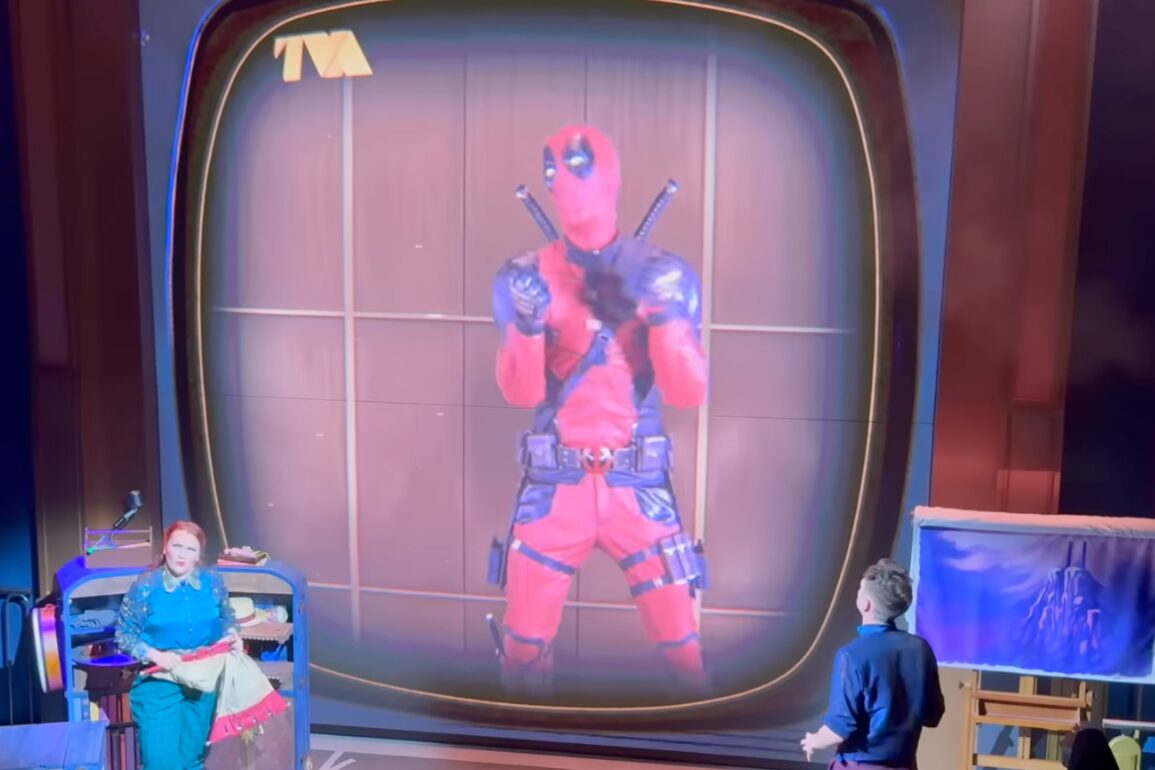 The raucous antihero Deadpool appears on a screen behind the storytellers, ready to kick their show up a notch. Full of sassy Disney vacation jokes, he tells the duo that he has prepared special sock puppets to end the show with “a good scene.” Of course, Deadpool’s idea of a good scene is sock puppets of himself and Wolverine riding in a car.