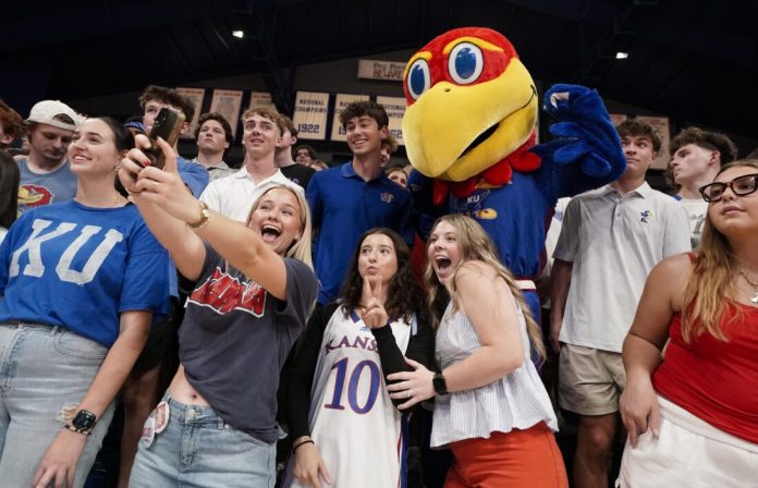 Big Jay squeezes in for a selfie with several fans in the Kansas student section during Late Night in the Phog on Friday, Oct. 17, 2025 at Allen Fieldhouse. Photo by Nick Krug