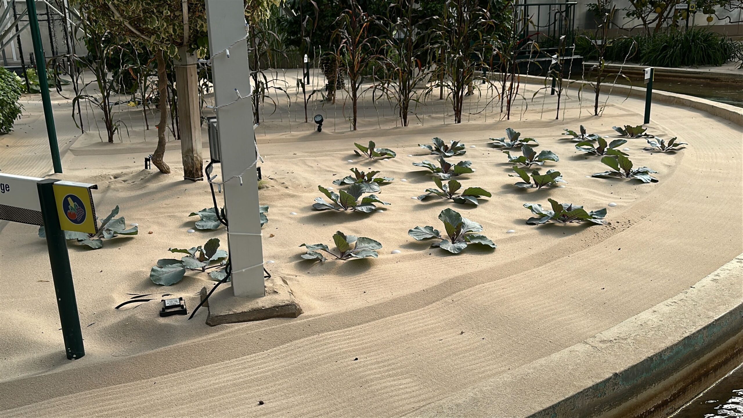 Also easy to miss are the teeny-tiny round lights nestled among plants in the sand. If you look closely at the cabbage above, you’ll see the little white lights between the plants.