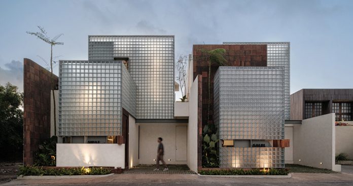 The exterior presents a geometric volume defined by expanses of glass blocks. The material lends a soft glow to the facade and filters silhouettes within, offering privacy while inviting curiosity from the street.