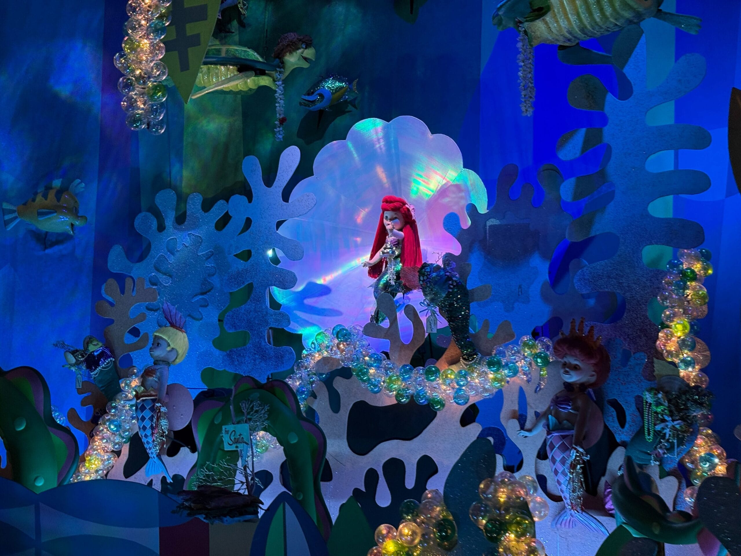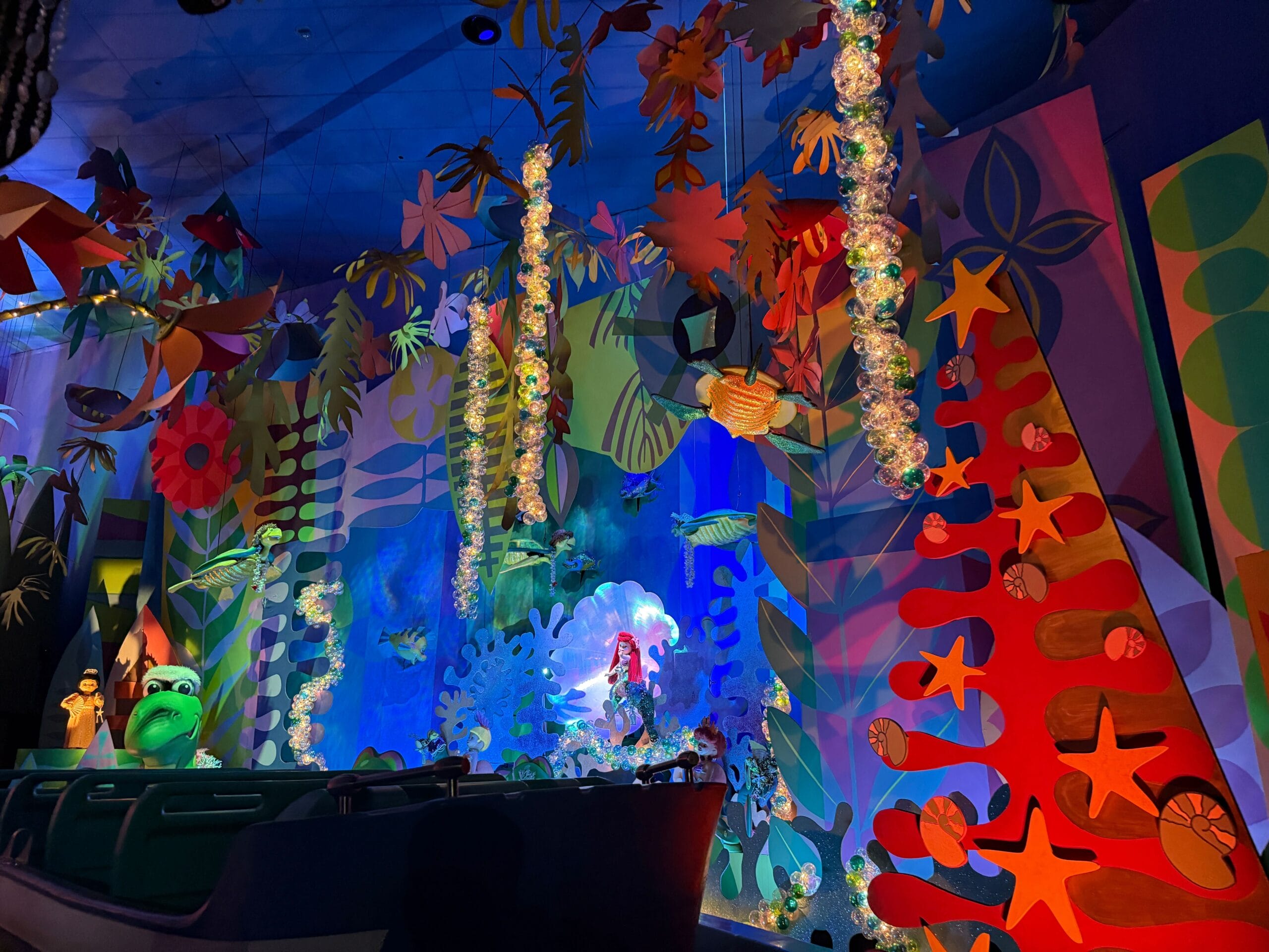 Moving into Africa, there are additional string lights and lanterns on tall sticks. Bubbly garland hangs around Ariel.