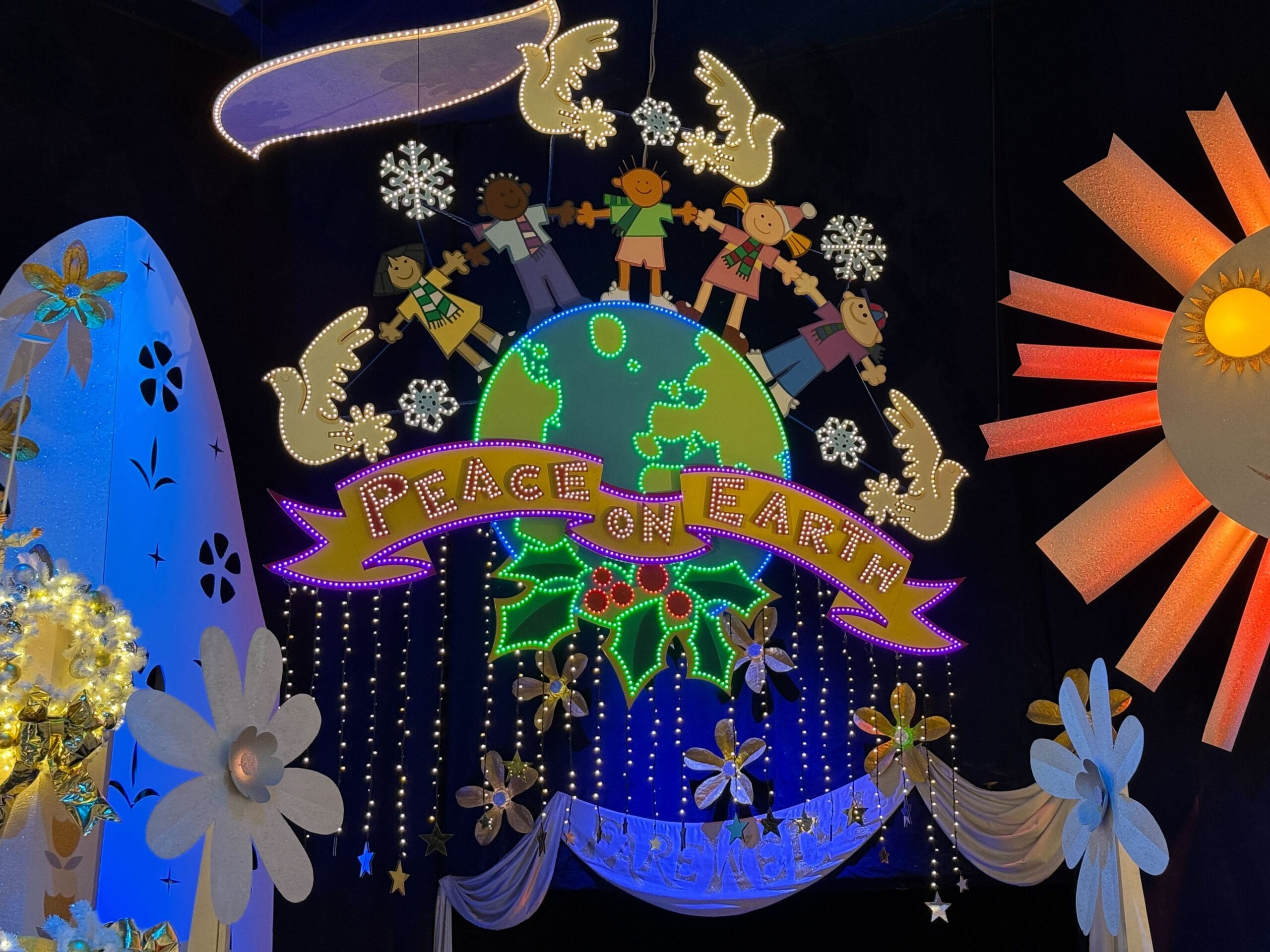 This room has gained trees trimmed with lights, a giant nutcracker, and a “Season’s Greetings” banner across the British bridge. There’s also garland, wreaths, paper chains, and faux candles.