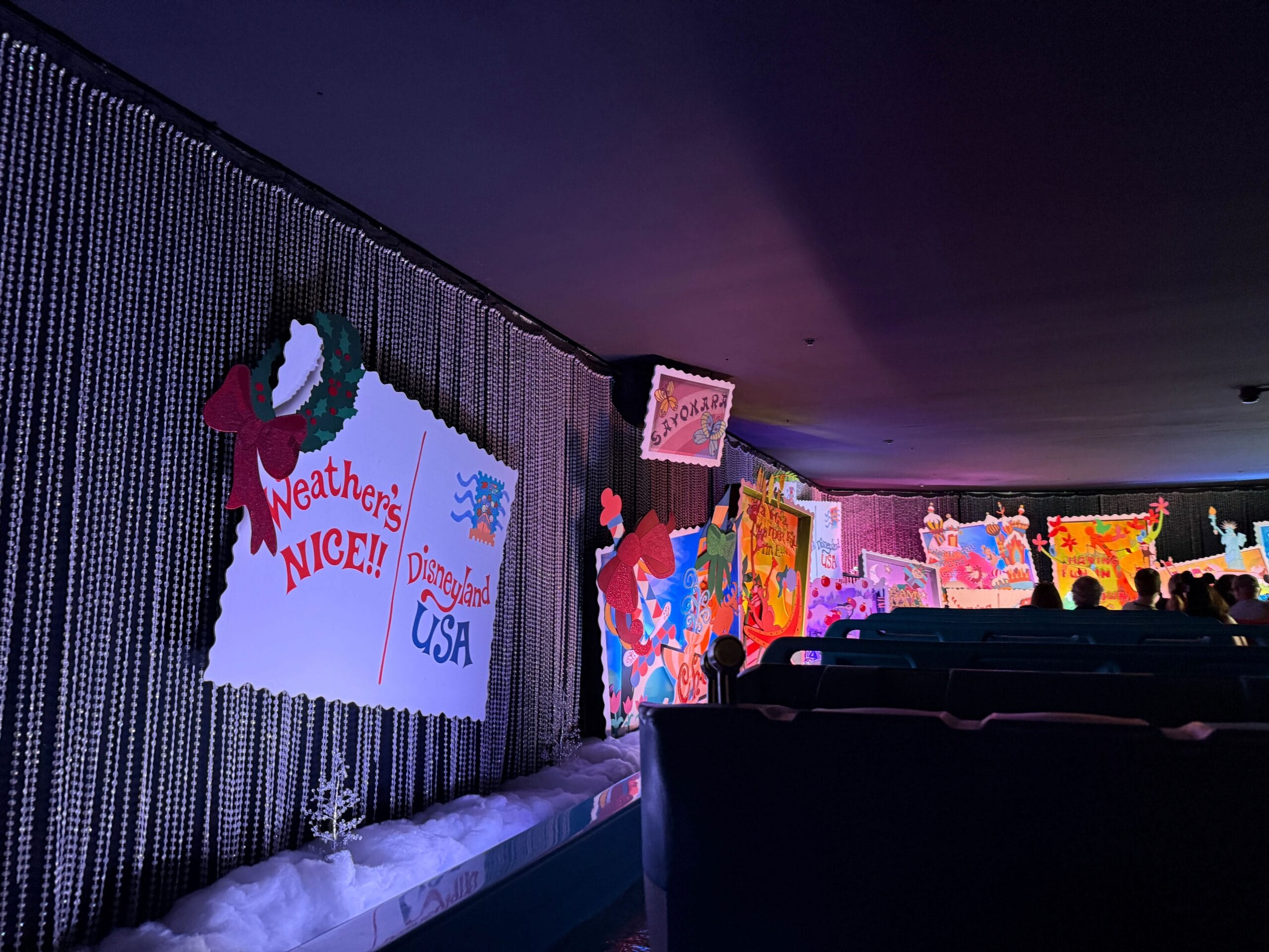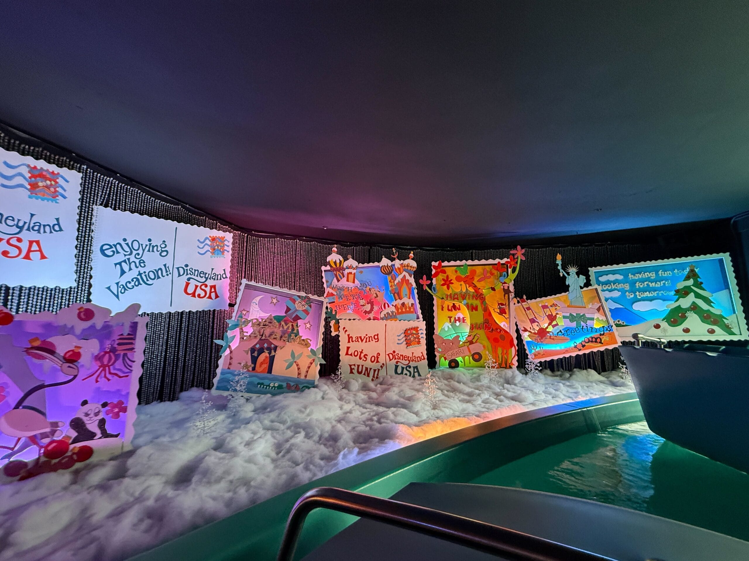 The final area before you exit has seasonal postcards, including one with a reath and a red bow, which reads Weather’s nice!! Disneyland USA.