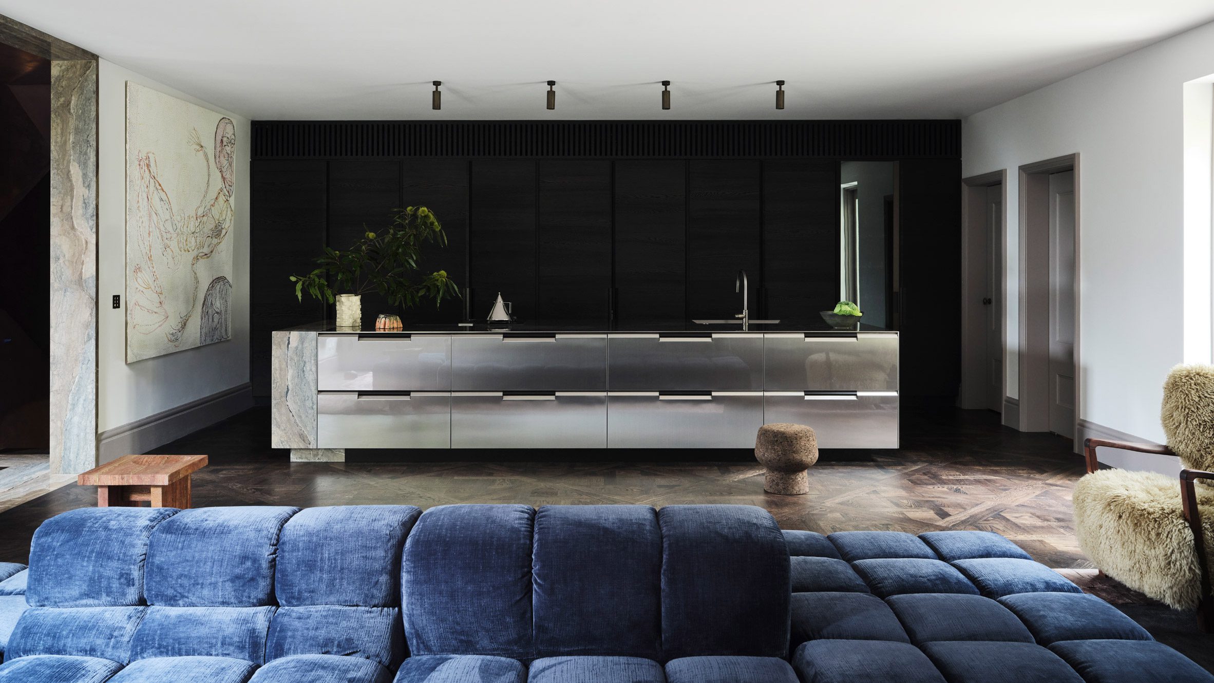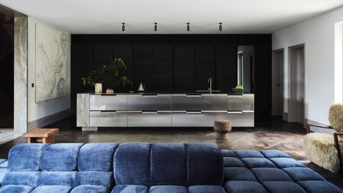 The house’s dramatic colour palette aims to provide a “modern gothic” feel informed by Bram Stoker’s novel Dracula. Inky blue tones and cool steel finishes combine with deep burgundy hues, including the custom marmorino Venetian plaster applied in the entryway and staircase.