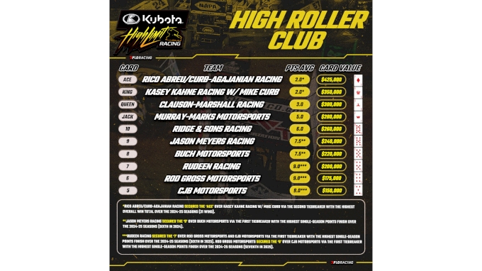 The High Roller Club will shuffle any newly-issued cards into the deck beginning in the 2028 season. All present membership cards will carry forward. Future membership rankings will continue to be based on each team’s two-year average finish in the Kubota High Limit Racing point standings.