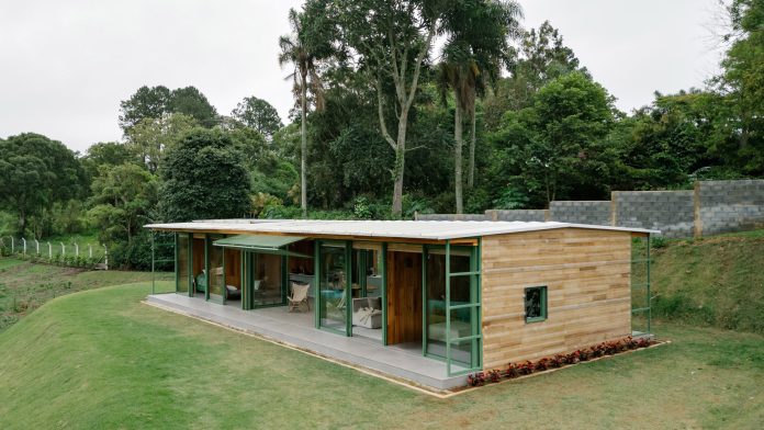 Local studio Nitsche Arquitetos has completed a modular, cross-laminated timber house with a rectangular dogtrot-style plan outside of São Paulo, Brazil.
