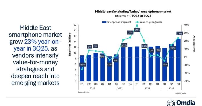 New data from Omdia reveals a strong rebound in the Middle East smartphone market (excluding Turkey) in 3Q25, with shipments rising 23% year on year to 15.1 million units. The growth was primarily driven by rising demand in key mass-market segments, where consumers are upgrading from older or entry-level devices to more capable mid-tier 4G and affordable 5G smartphones. Vendors capitalized on this momentum by focusing on value-for-money portfolios and expanding their presence in emerging markets, where affordable 4G models continue to drive high-volume adoption.