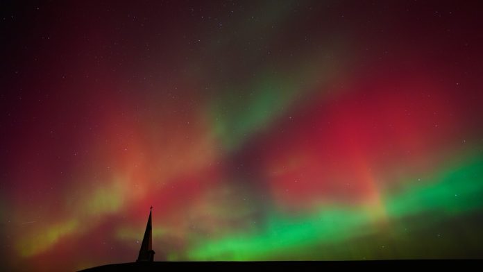I decided to head to a spot not too far away, which I discovered a few weeks ago while shooting a comet photo. This location was simply a repurposed old church steeple that moved to hilltop with nothing else obstructing the horizon. Once there, as if on command, the sky really lit up. I could see the red and green colors clearly covering most of the northern horizon with some of the light show even stretching overhead. I knew this could be a fleeting experience, so I rushed to set up my tripod and ready my camera. The photo was shot with a Sony A9III camera with a 12-24mm f/4 lens. Exposure was 15 seconds at F/4, ISO 800. Color balance was set on auto. I shot the photo at 12mm to capture as much of the sky as possible but still this wasn’t wide enough to get the entirety of the display. The whole event lasted about 15 minutes and faded away as rapidly as it appeared.