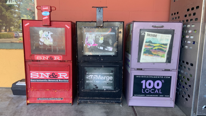 An abandoned Sacramento Bee newspaper vending box. (Photo by Eric