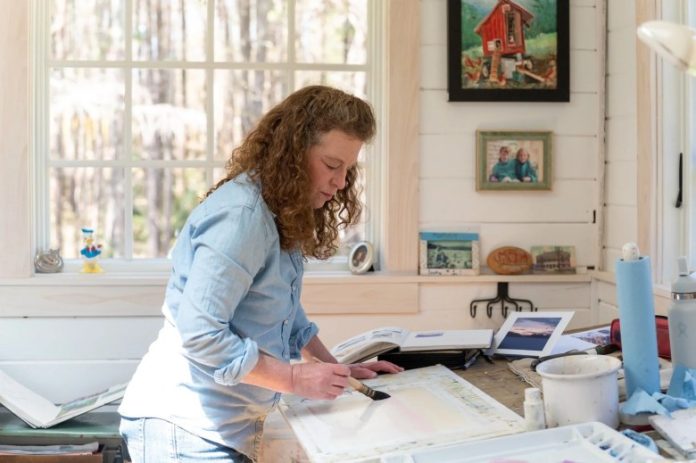 On Saturday, Ball is opening the doors of her Falmouth home studio, which is made up of two horse stables that were converted to a workspace. She will give painting demonstrations and chat with visitors, who can also take a peek at her works in progress, see the shelves full of books that inspire her, and experience her work in the context in which it was created.