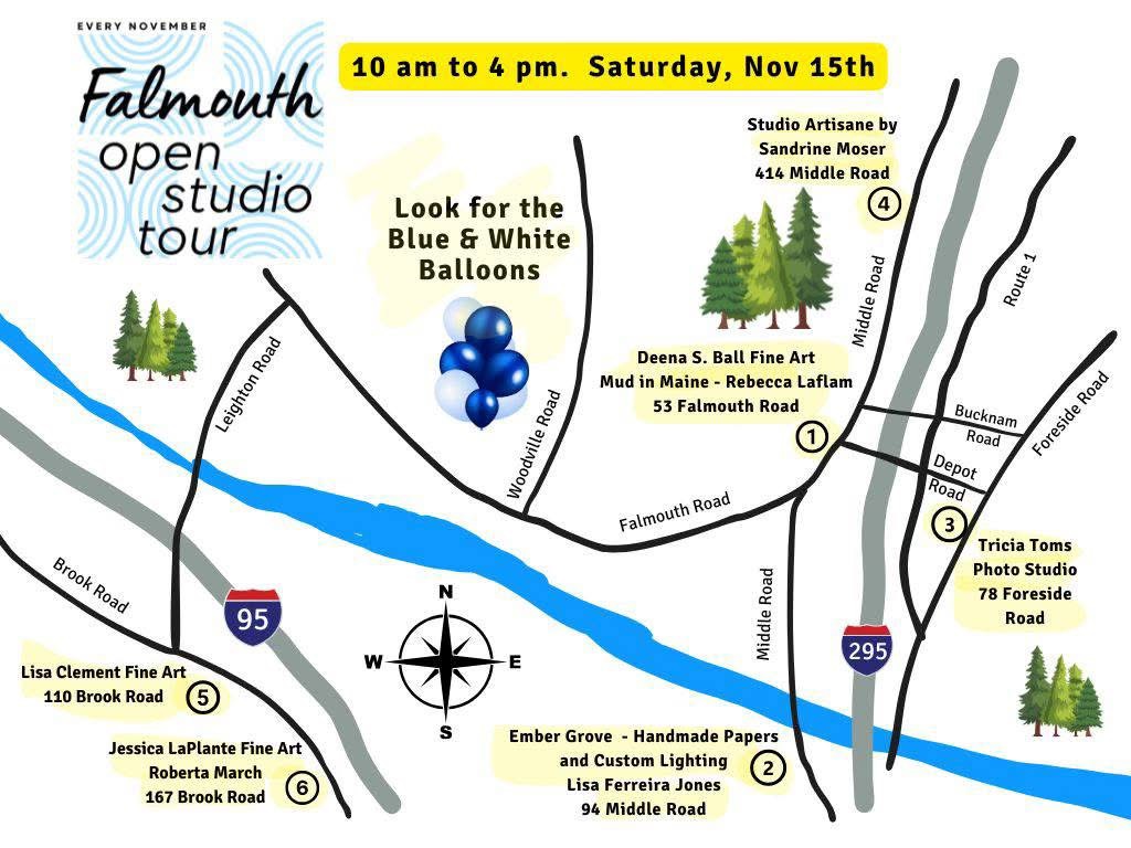 “Falmouth Open Studio Tour” is on Saturday, Nov. 15, from 10 a.m. until 4 p.m. Use the map with addresses to all the studios, or keep an eye out for blue and white balloons outside participating studios on Saturday. Email Deena Ball at [email protected] with questions.
