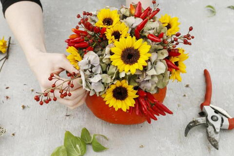 Make a pumpkin centerpiece! Simply hollow out a big pumpkin or giant gourd, scoop the seeds (to save for eating), and place a vase inside. You can simply add cut flowers from the store or supplement with grasses and flowers around your property (such as those fading hydrangeas).