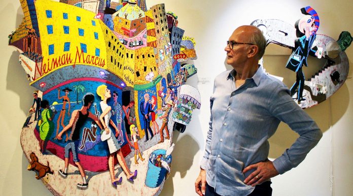 City of Gold (2012) was, according to Piskoti, another. He liked how busy this painting was. Nieman Marcus and a beauty salon top off his carefully sculpted design which shows a very stylish woman in white having her purse stolen, a theme and design style he revisited more than once.