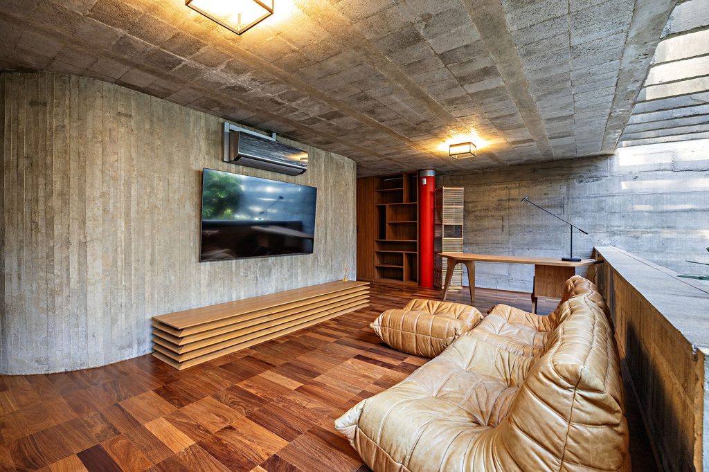Across 3,982 square feet, the renovation introduces contemporised spatial gestures without erasing the past. New openings carved out of the concrete structure draw in softer natural light, while a glass-covered garden adds transparency and a sense of pause between rooms. A gourmet area, solarium with hot tub and a sauna extend the home’s leisure spaces, all with modernised plumbing and electrical systems. Solar heating, full-home air conditioning and selective automation update the building’s performance.