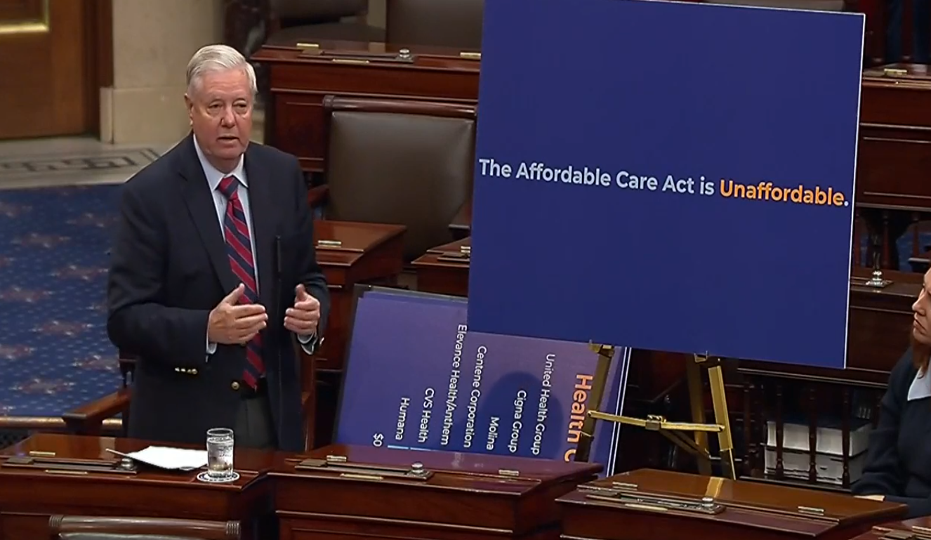 When speaking about what he calls the “Unaffordable” Care Act, Graham stands next to a chart showing what healthcare companies receive under Obamacare, including United Health Care, Cigna, Anthem/Elevance, CVSHealth Benefits, Humana and Molina. “These are the winners, not you,” Graham said.