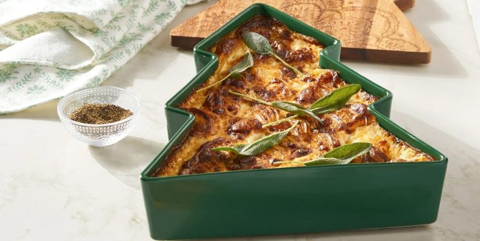 Let’s dish on the details, shall we? First, it’s perfectly sized at a four-quart capacity so it’ll fit standard sweet and savory recipes with ease. The tree itself is made of sturdy stoneware, which means all of those Christmas casseroles will bake and brown evenly before they’re served in style. That also means it’s dishwasher and microwave safe!