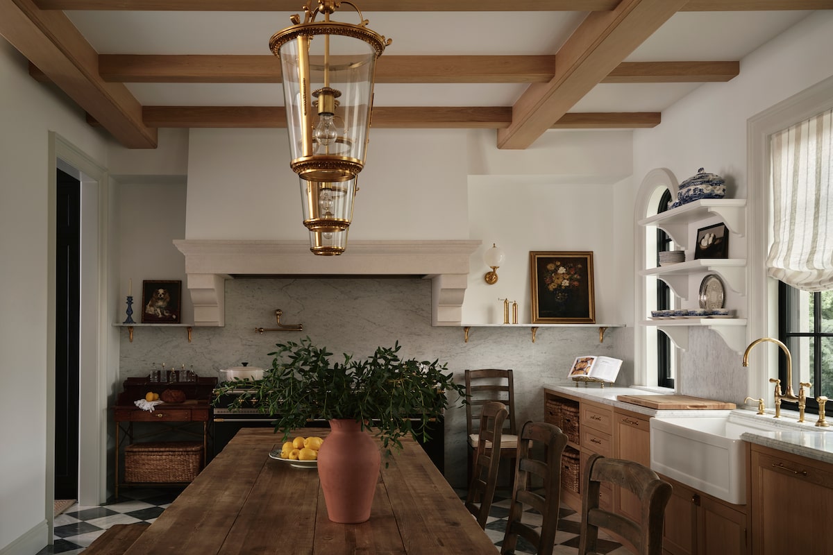 With its checkered floors, grand hood vent and classic cabinets, their kitchen was inspired by the paintings of Vermeer – right down to a crackling fireplace – so such a table felt right. “We wanted an element of authenticity, that old-world feeling that’s lost with modern, contemporary kitchens,” Pugliese says.