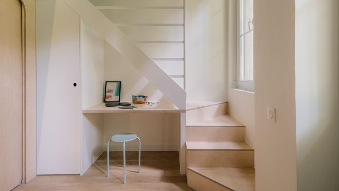 The designer chose birch plywood for the central module, which includes a bookcase for displaying decorative objects. The design of the staircase was particularly inspired. “As adults, we don’t want to climb a ladder to go to bed,” says Christiaen. “So I created this staircase as a real piece of furniture, a work of architecture in its own right that enhances the studio, its high ceilings, and its light.” To achieve this effect he designed the staircase using two materials, with the first four steps made of wood and incorporating storage space, followed by a more open section in white metal, allowing sunlight to pass through both into the office below and also to the mezzanine.