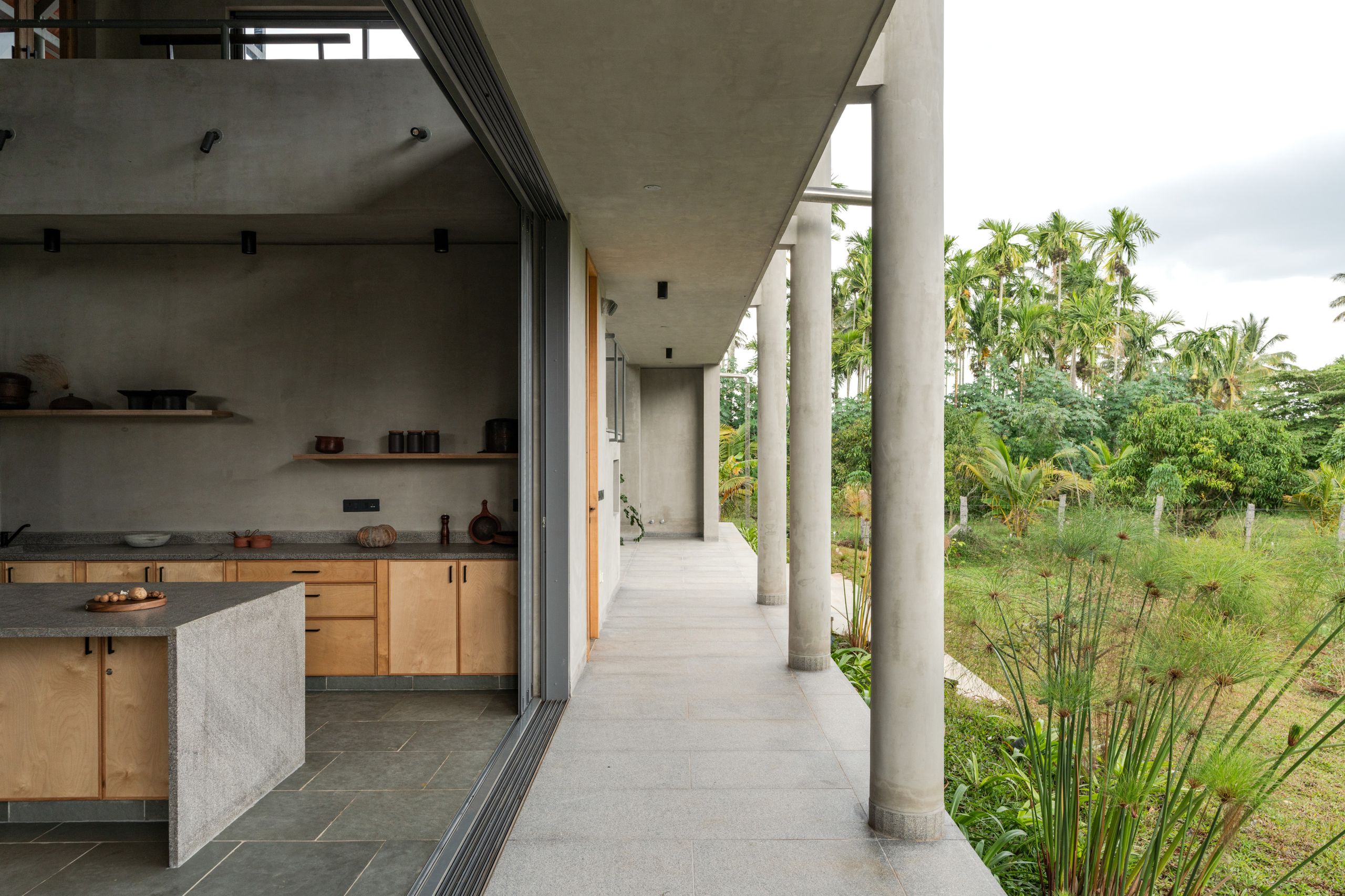 The house is inserted into a space alongside mature trees and large boulders, with the raised concrete plinth creating a sense of being a part of the landscape. The material palette is simple, with a steel frame holding up the roof above hand-finished cement walls and columns. The latter add a rhythm to the view, framing the lush green surroundings and casting shadows across the interior and verandas. Underfoot, Kota stone flooring in the living areas is paired with Sira stone in the bathrooms.