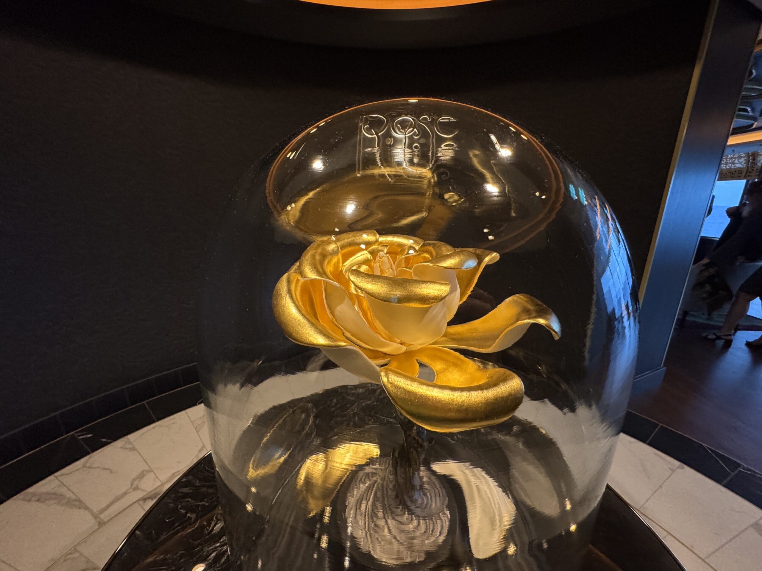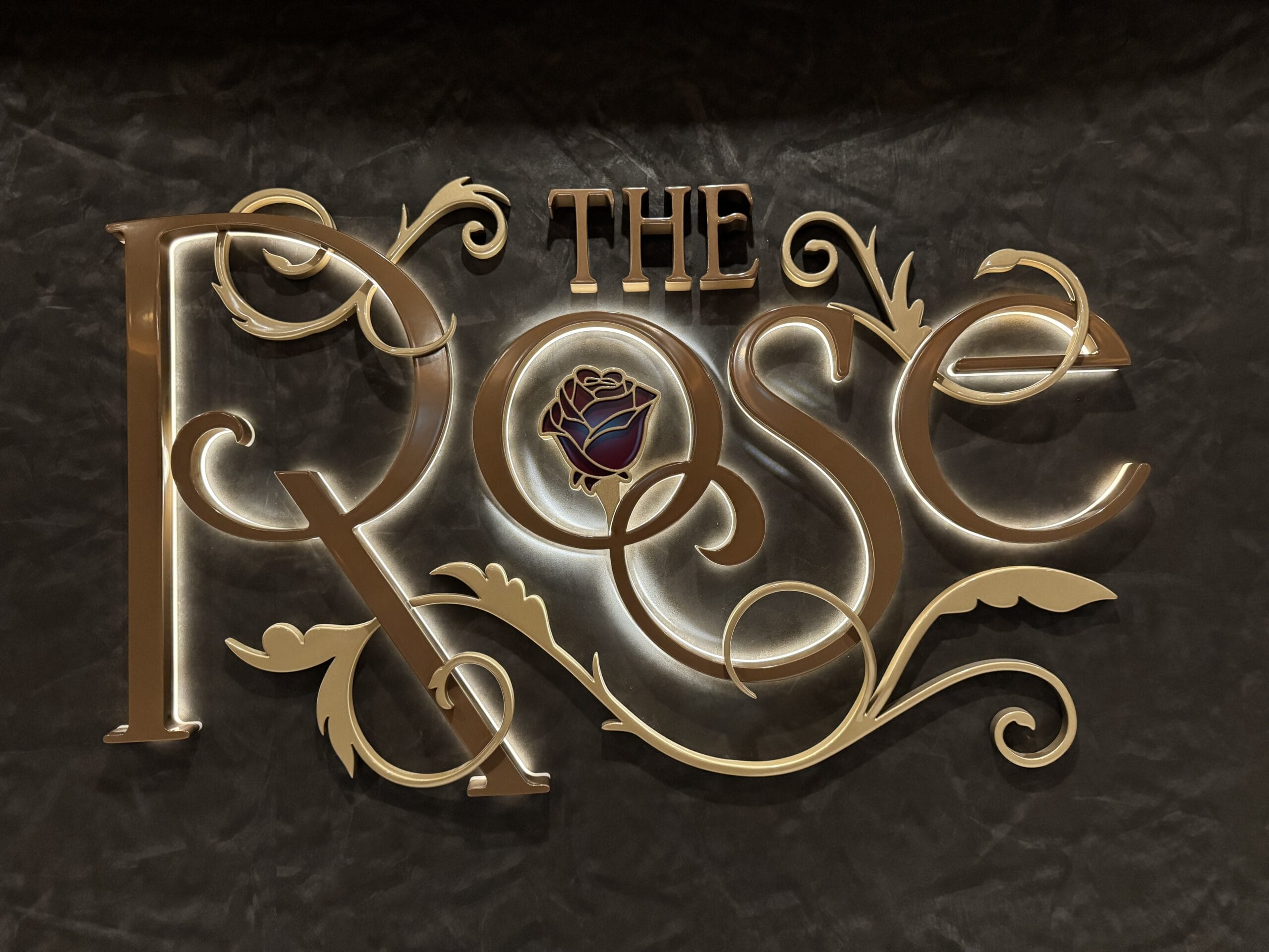 The golden sign on the wall features a red rose in the “o.” On the Wish, the rose in the sign is gold.