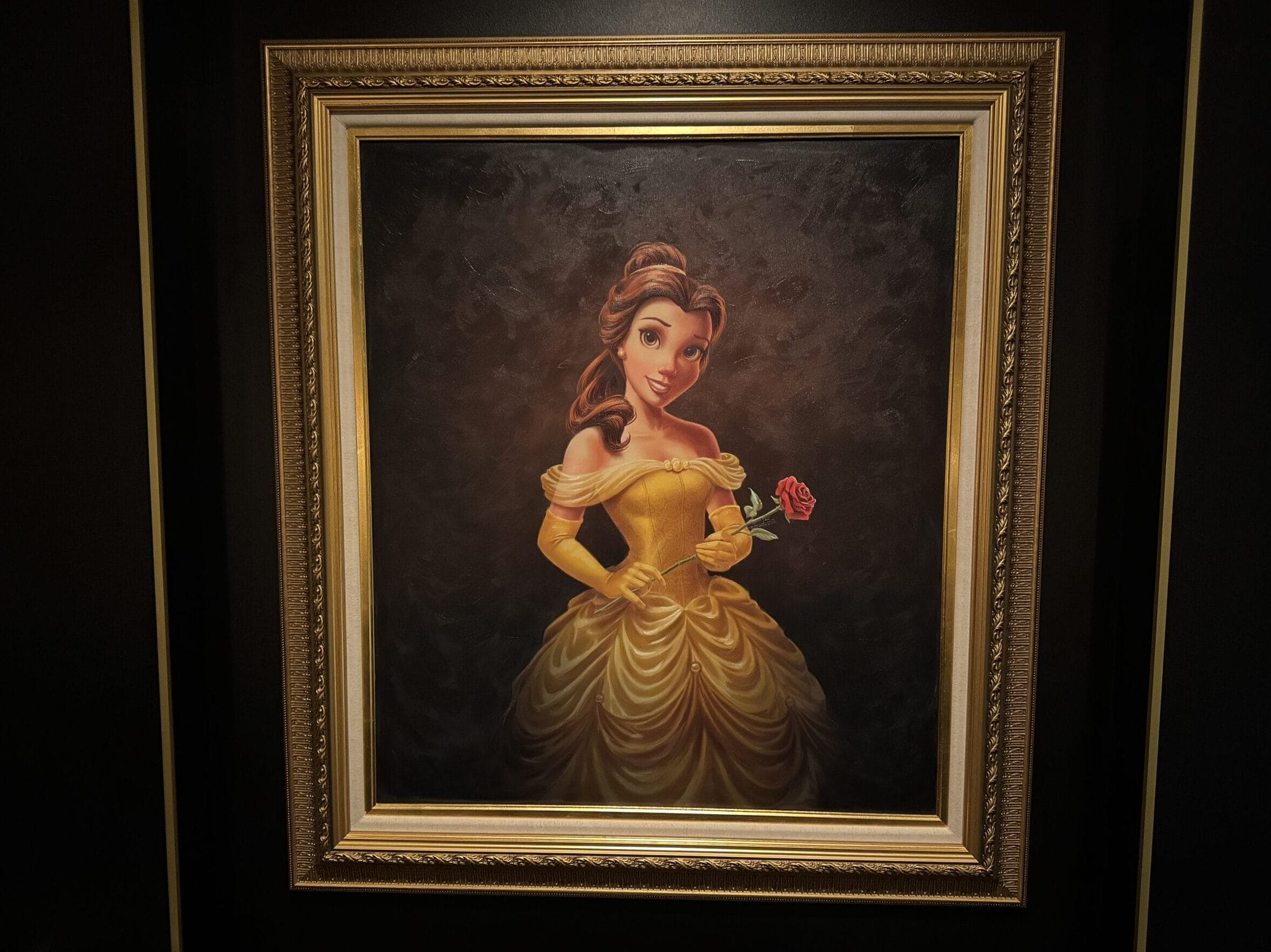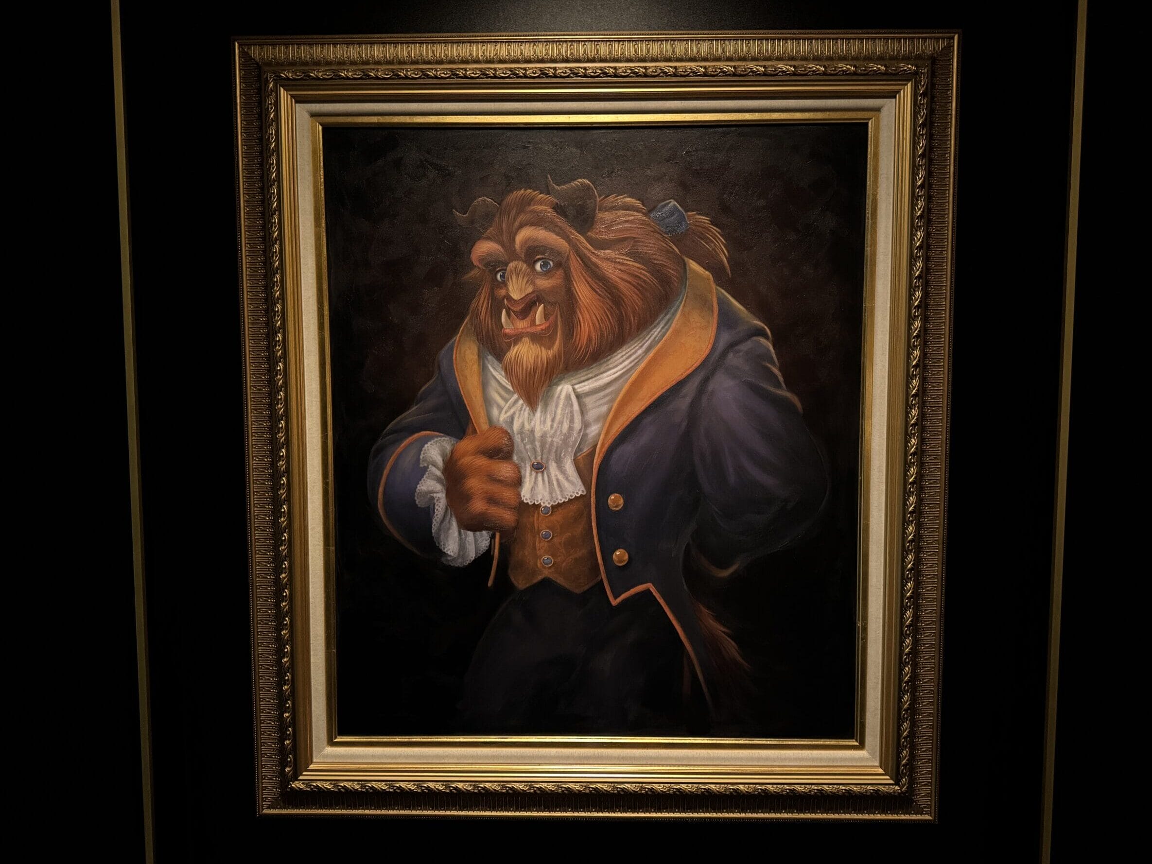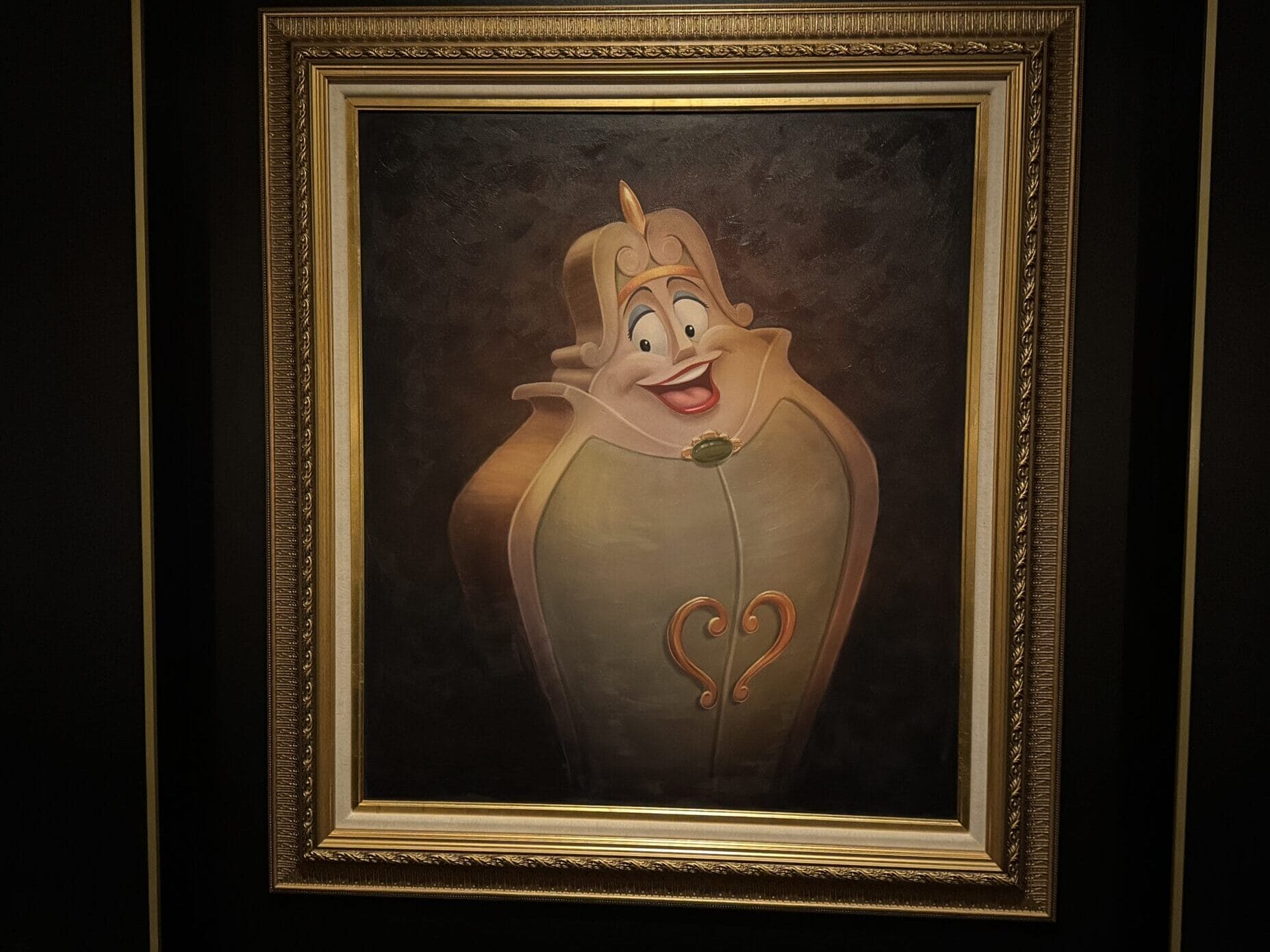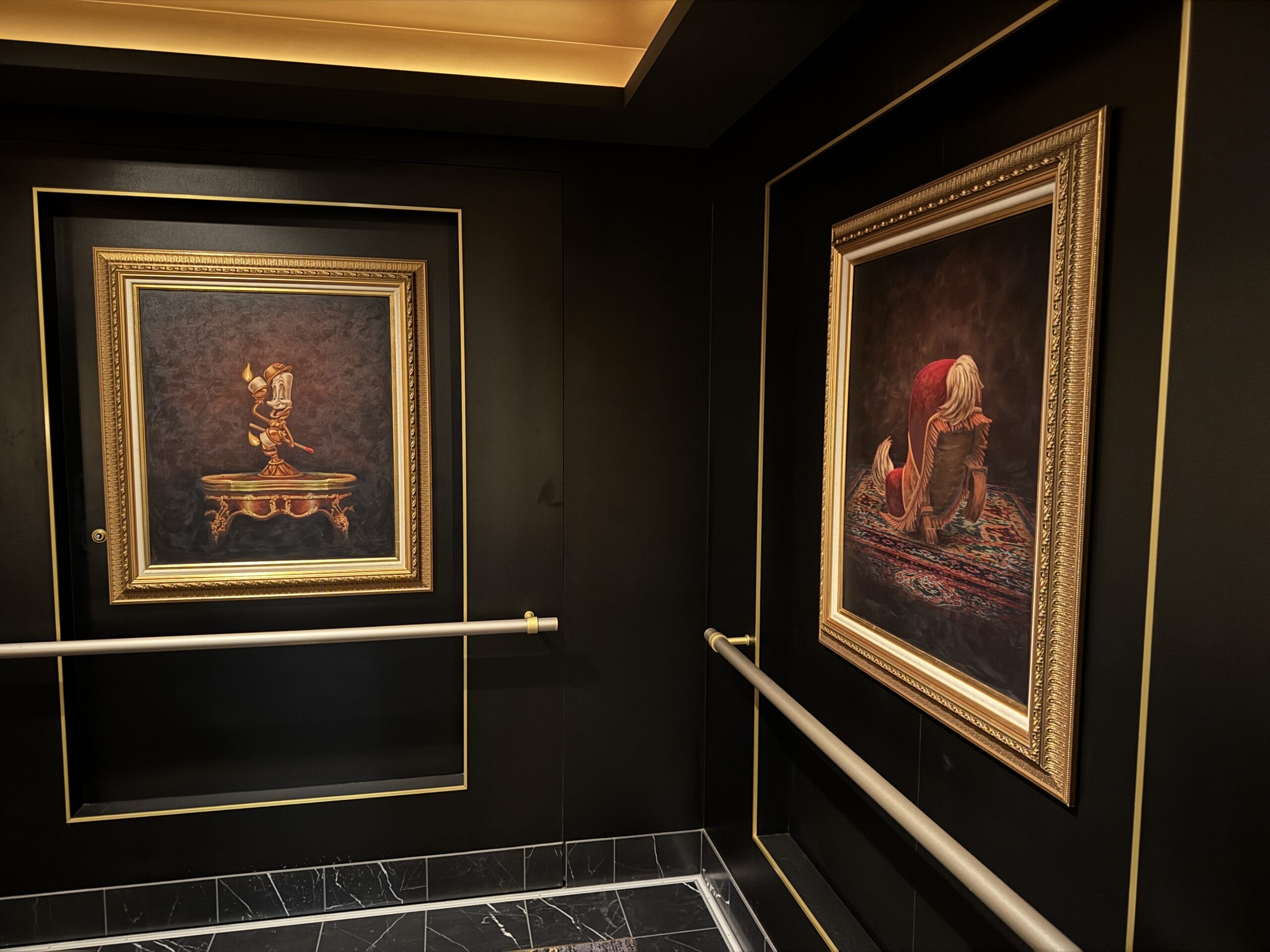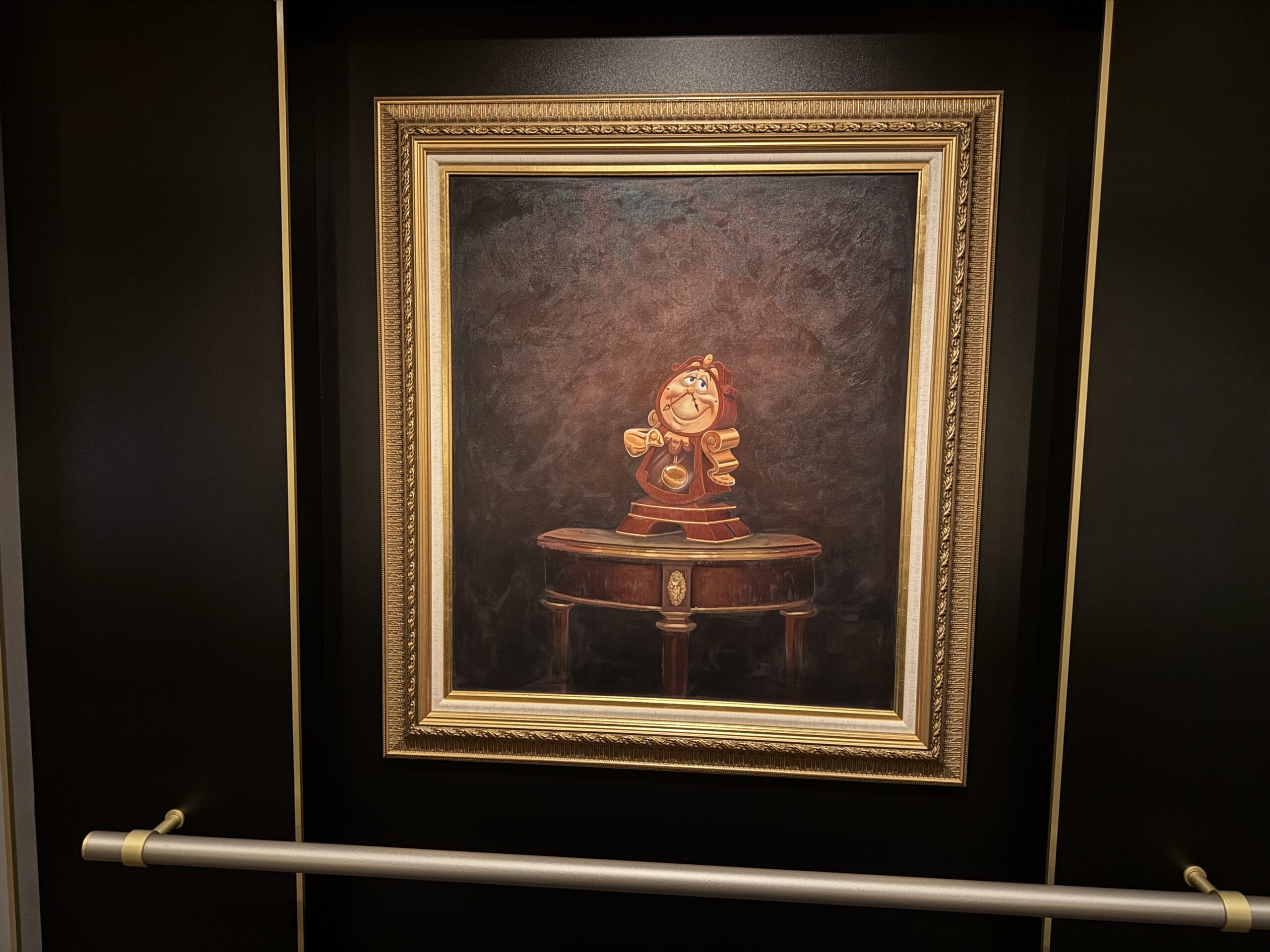 Shiny gold panels line the walls as do gilded frames with portraits of the animated characters from Beauty and the Beast.