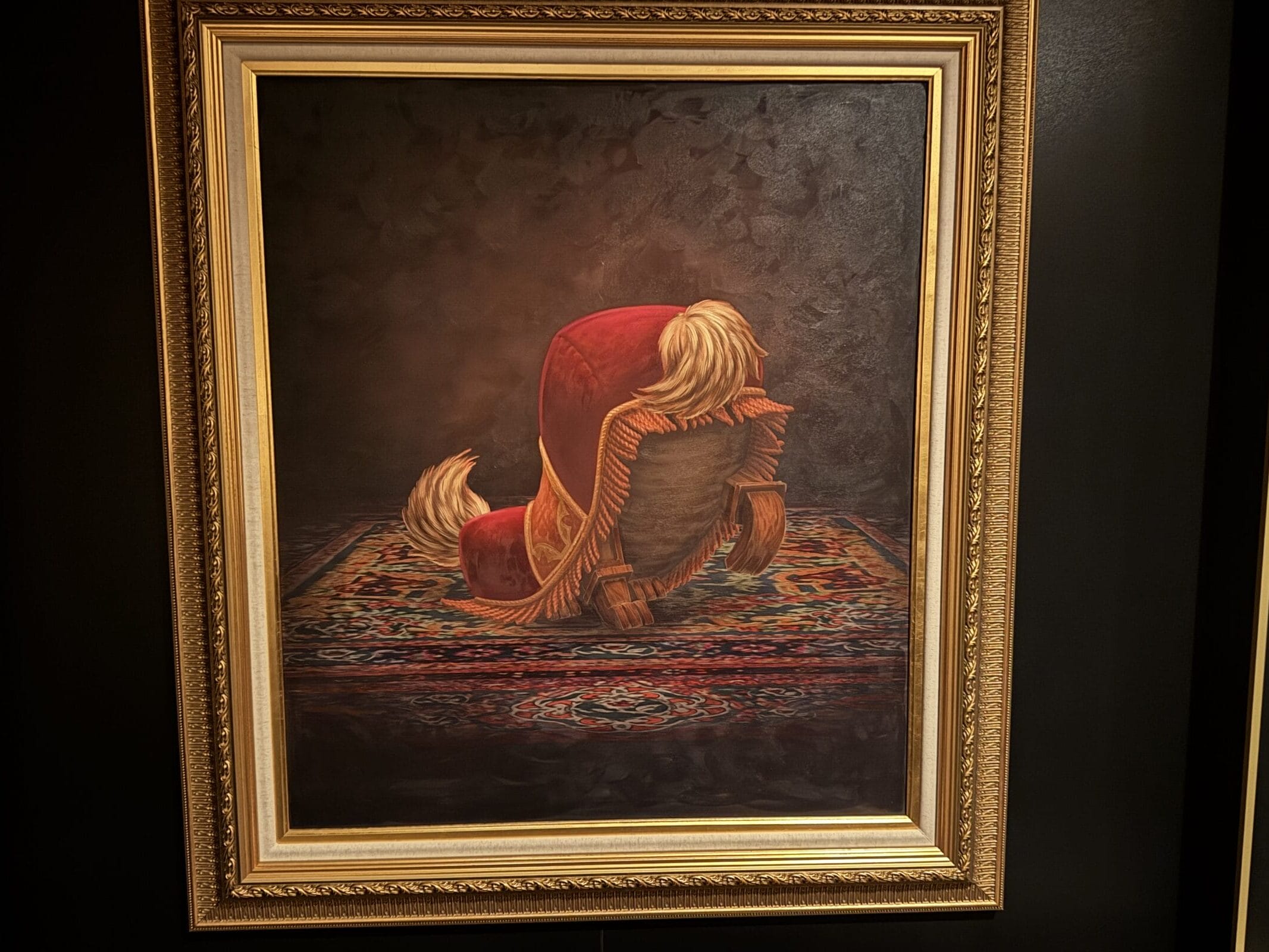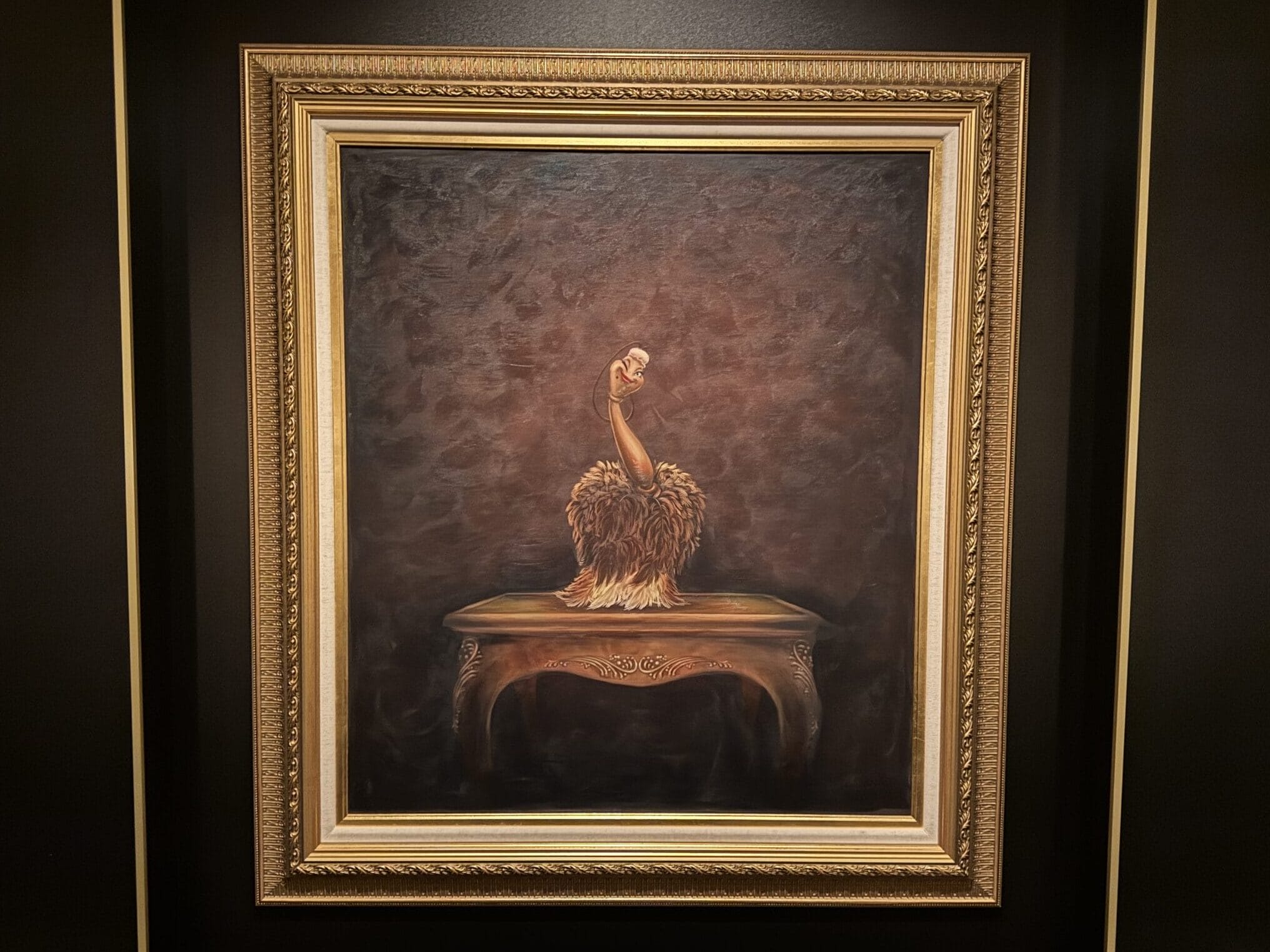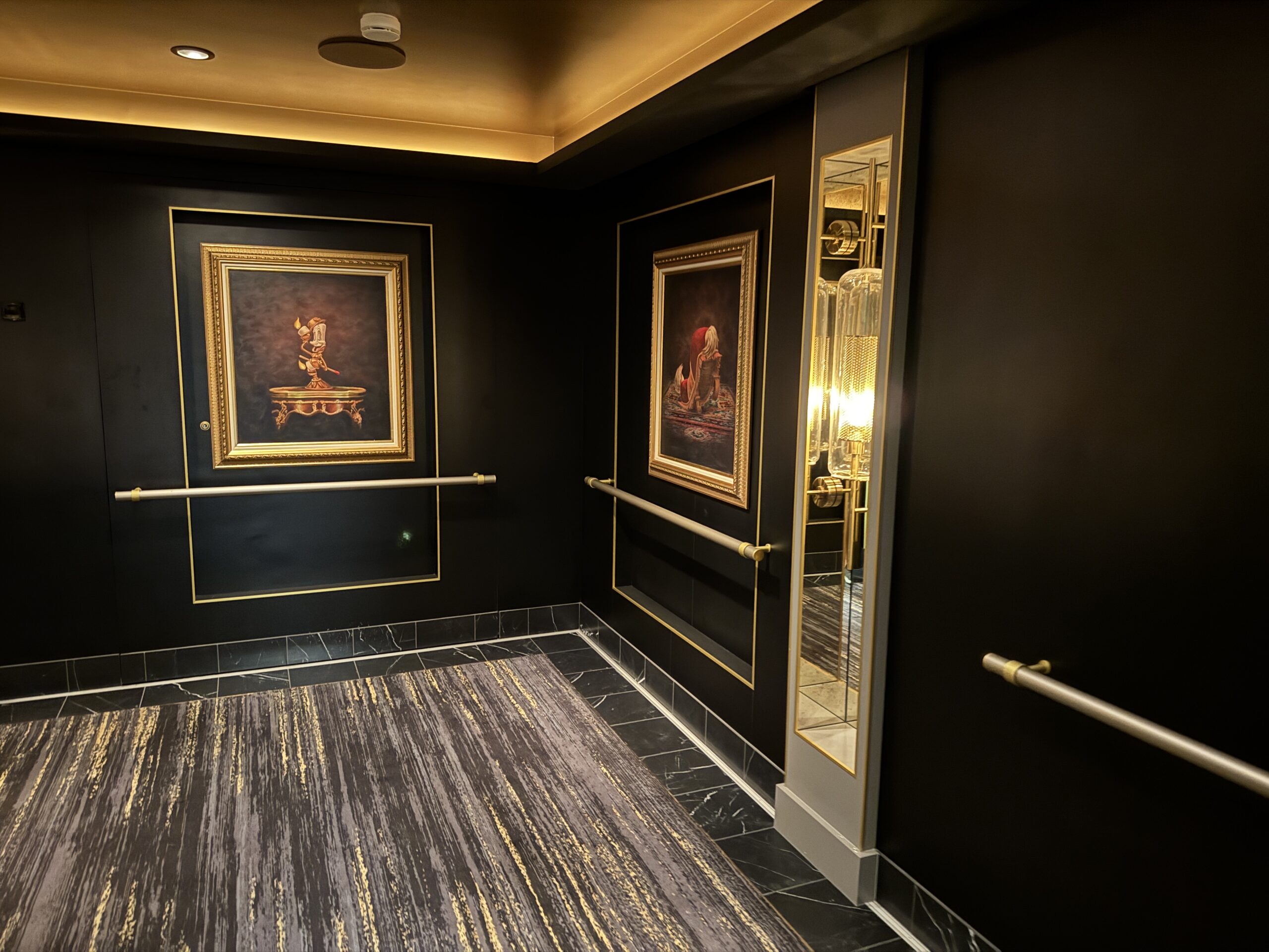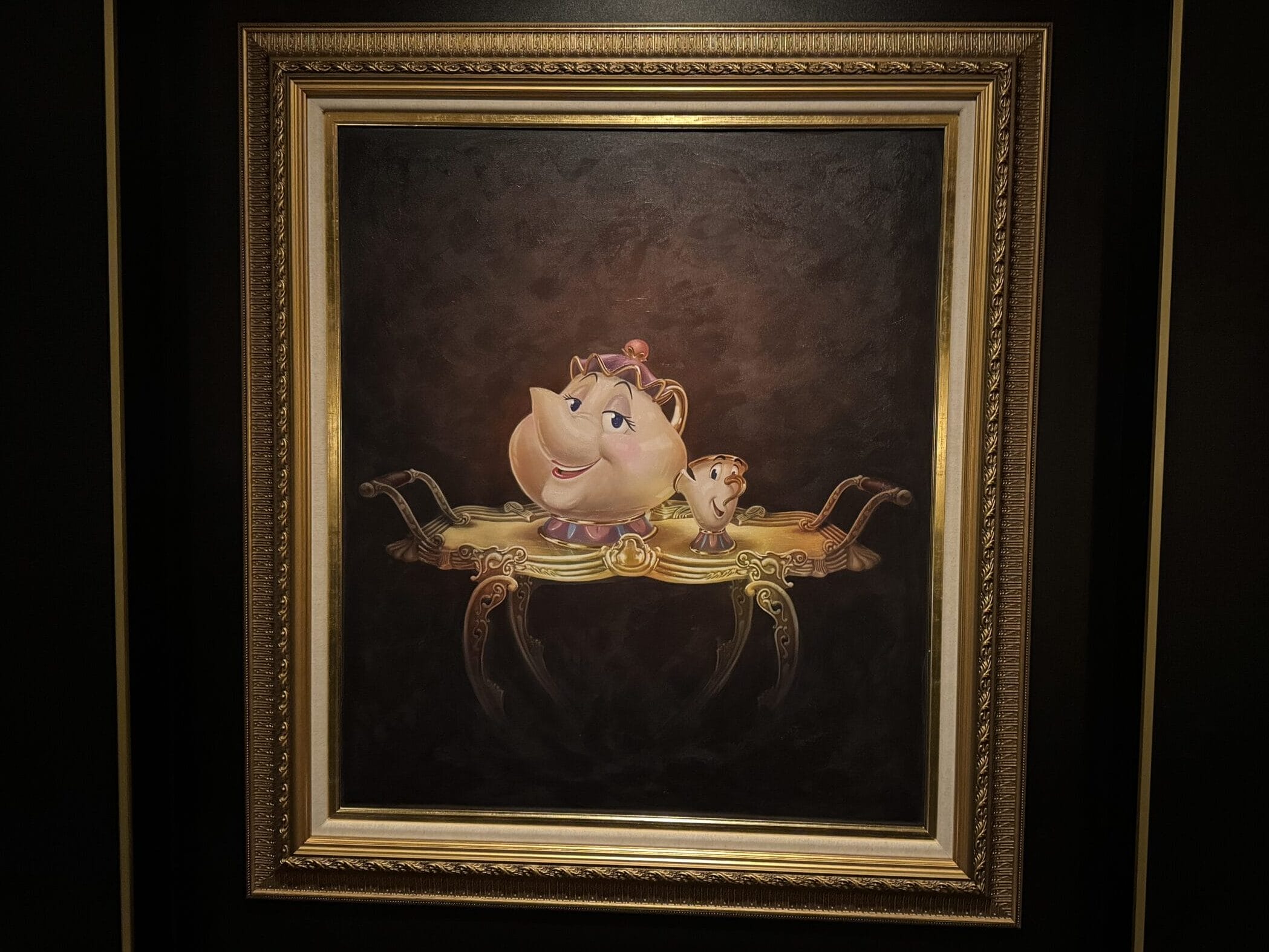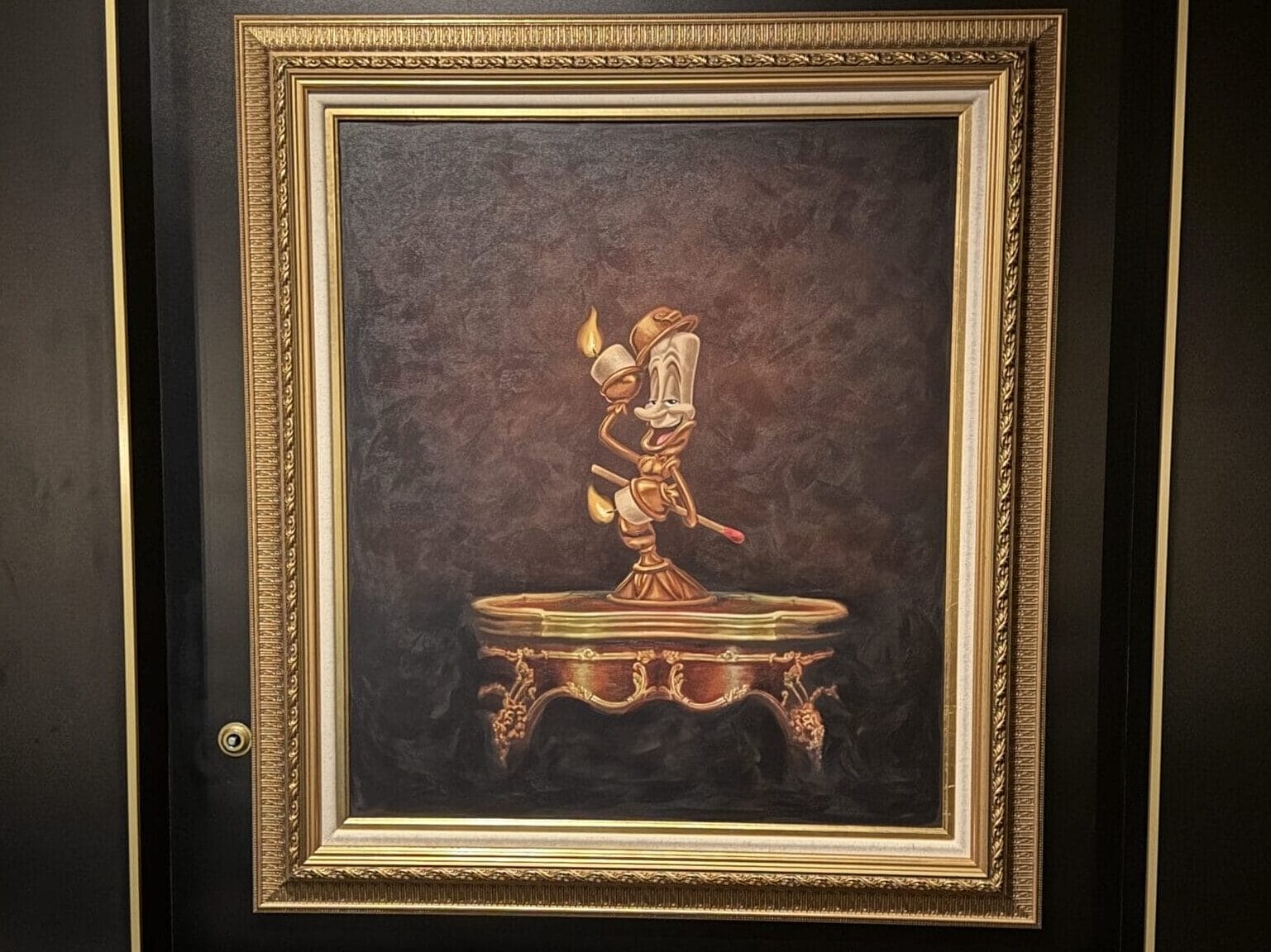 Shiny gold panels line the walls as do gilded frames with portraits of the animated characters from Beauty and the Beast.